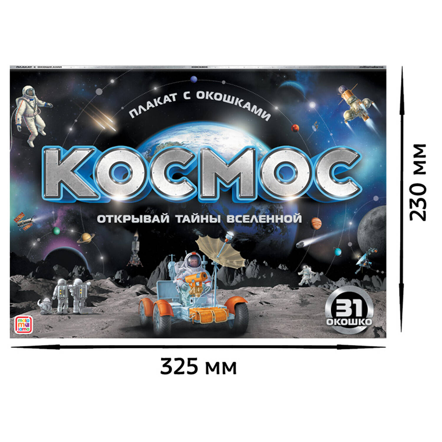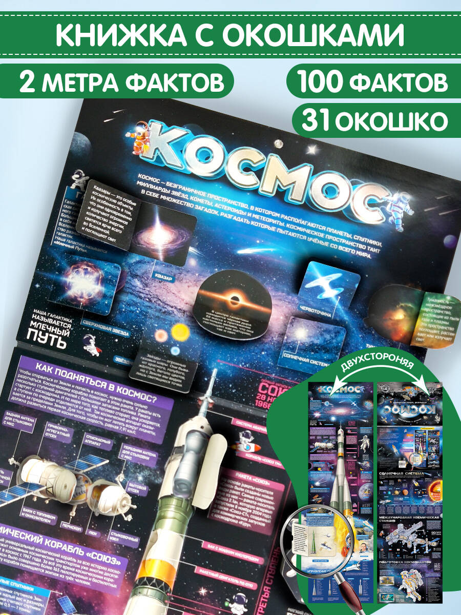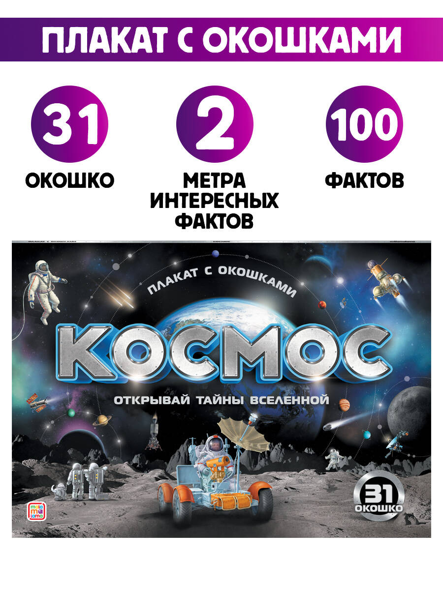 Серия "Плакат с окошками" от торговой марки Malamalama - новая форма с любимым содержанием. Это книжка-трансформер, которая развернётся в плакат и станет отличным дополнением учебного уголка. Плакат с окошками "Космос" - это ответы на десятки вопросов маленького почемучки о строении Вселенной, о космонавтах и космических кораблях, о знаменитых открытиях и полётах, о МКС и скафандрах. Красочные иллюстрации дополняют процесс изучения и способствуют запоминанию информации.