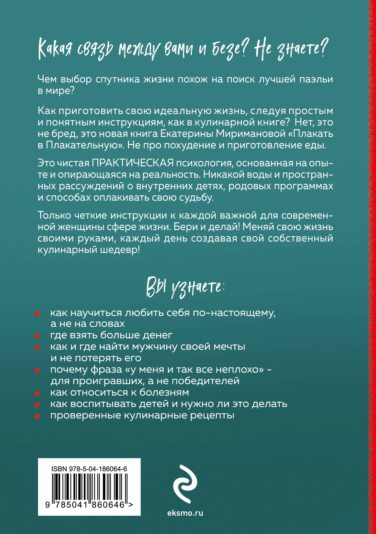 Какая связь между вами и безе? Не знаете? А чем поиск спутника жизнь похож на посещение ресторанов в поисках лучшей паэльи мира? И как приготовить свою идеальную жизнь, следуя простым и понятным инструкциям, как в кулинарной книге? Нет, это не бред, это новая книга Екатерины Миримановой «Плакать в Плакательную». Не про похудение и приготовление еды. Это чистая ПРАКТИЧЕСКАЯ психология, основанная на опыте и опирающаяся на реальность. Никакой воды и пространных рассуждений о внутренних детях, родовых программах и способах оплакивать свою судьбу. Только четкие инструкции к каждой важной для современной женщины сфере жизни. Бери и делай! Меняй свою жизнь своими руками, каждый день создавая свой собственный кулинарный шедевр!| Издательство | ООО "Издательство "Эксмо" |