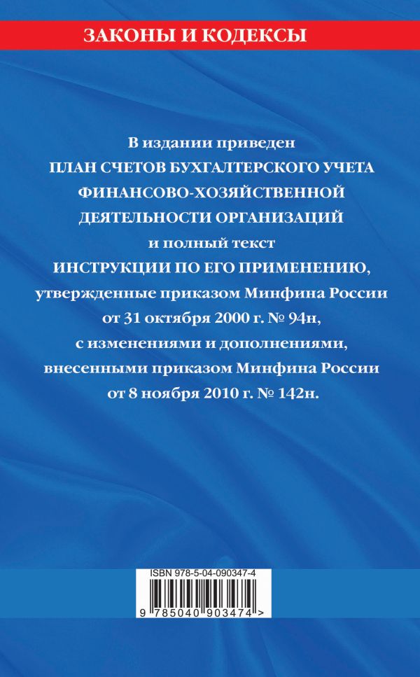 В издании приведен План счетов бухгалтерского учета финансово-хозяйственной деятельности организаций и полный текст Инструкции по его применению, утвержденные приказом Минфина России от 31 октября 2000 г. № 94н, с изменениями и дополнениями, внесенными приказом Минфина России от 8 ноября 2010 г. № 142н.