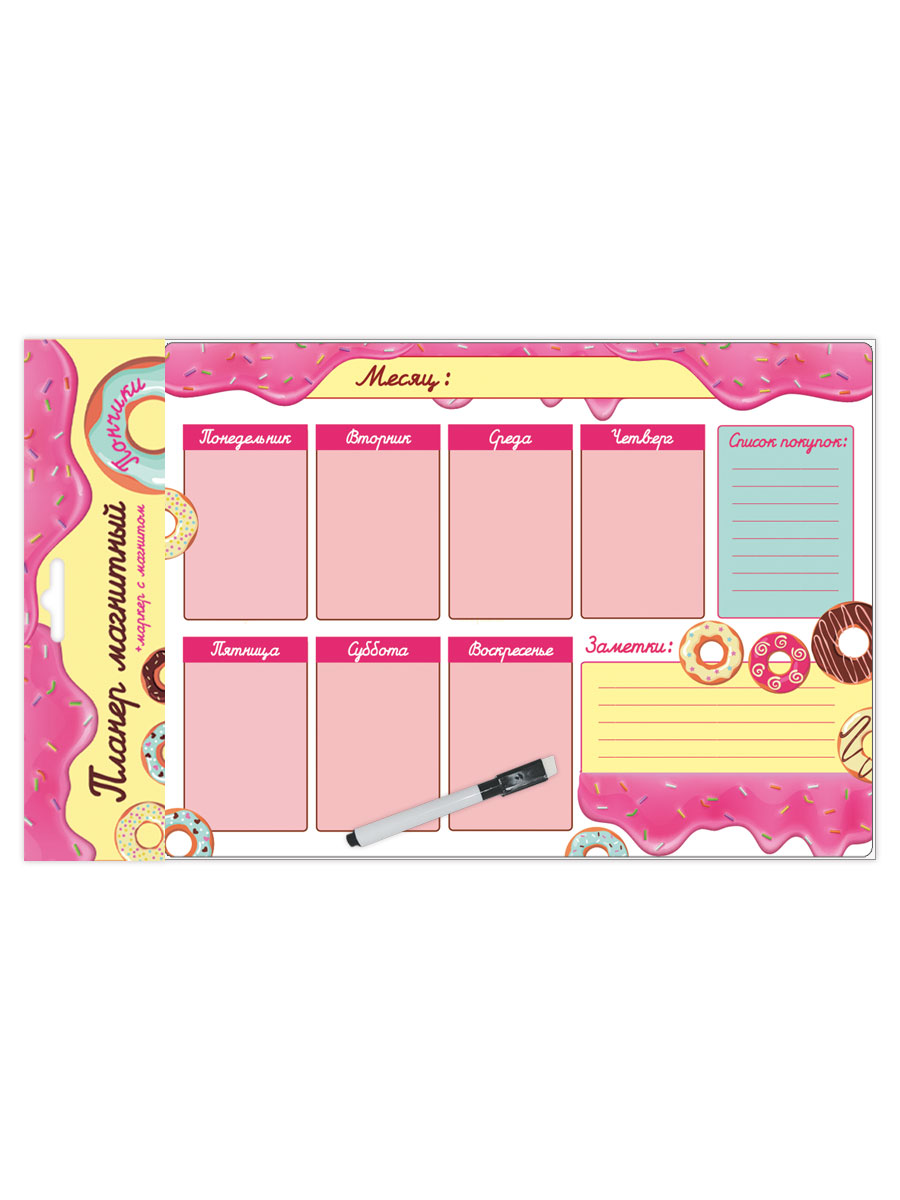 Аппетитный дизайн "Пончики" рассчитан на неделю. Вы также сможете оформить свой список покупок и записать важное в раздел "Заметки".