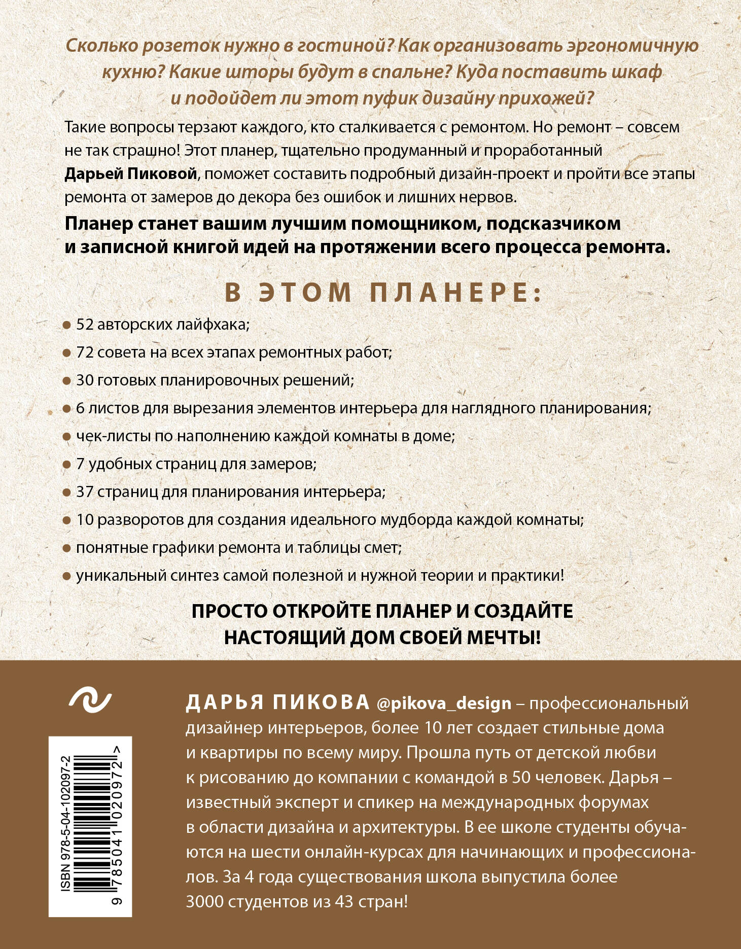 Сколько розеток нужно в гостиной? Как организовать эргономичную кухню? Какие шторы будут в спальне? Куда поставить шкаф и подойдет ли этот пуфик дизайну прихожей? Печально знакомые вопросы для каждого, кто сталкивался с ремонтом, особенно капитальным. Но что, если к дому ваше мечты ведет тщательно продуманный и грамотно составленный план? От советов по замеру до чек-листа для новоселья? Планер ремонта от профессионального дизайнера интерьеров Дарьи Пиковой станет вашим лучшим помощником, подсказчиком и записной книгой идей на протяжении всего ремонта. В этом планере: • 52 авторских лайфхака; • 72 совета на всех этапах ремонтных работ; • 30 готовых планировочных решений; • 6 листов для вырезания элементов интерьера для наглядного планирования; • чек-листы по наполнению каждой комнаты в доме; • 7 удобных страниц для замеров и 37 страниц для планирования интерьера прямо в планере; • 10 разворотов для создания идеального мудборда каждой комнаты; • понятные графики ремонта и таблицы смет; • уникальный синтез самой полезной и нужной теории и практики! Дарья Пикова @pikova_design - профессиональный дизайнер интерьеров, более 10 лет создает стильные дома и квартиры по всему миру. Прошла путь от детской любви к рисованию до компании с командой в 50 человек. Дарья - известный эксперт и спикер на международных форумах в области дизайна и архитектуры. В ее школе студенты обучаются на шести онлайн-курсах для начинающих и профессионалов. За 4 года существования Школа выпустила более 3000 студентов из 35 стран!