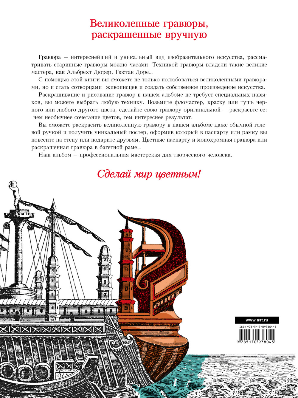 Альбом-раскраска. Издание для досуга. Раскрашивание и рисование гравюр в нашем альбоме не требует специальных навыков. Возьмите фломастер, краску или тушь черного или любого другого цвета - сделайте свою гравюру оригинальной. Вы сможете раскрасить великолепную гравюру в нашем альбоме даже обычной гелевой ручкой и получить уникальный постер, который по вашему желанию вы сможете оформить в паспарту или рамку. Раскрашивайте в этом альбоме сюжеты с людьми разных эпох и морские сюжеты.
