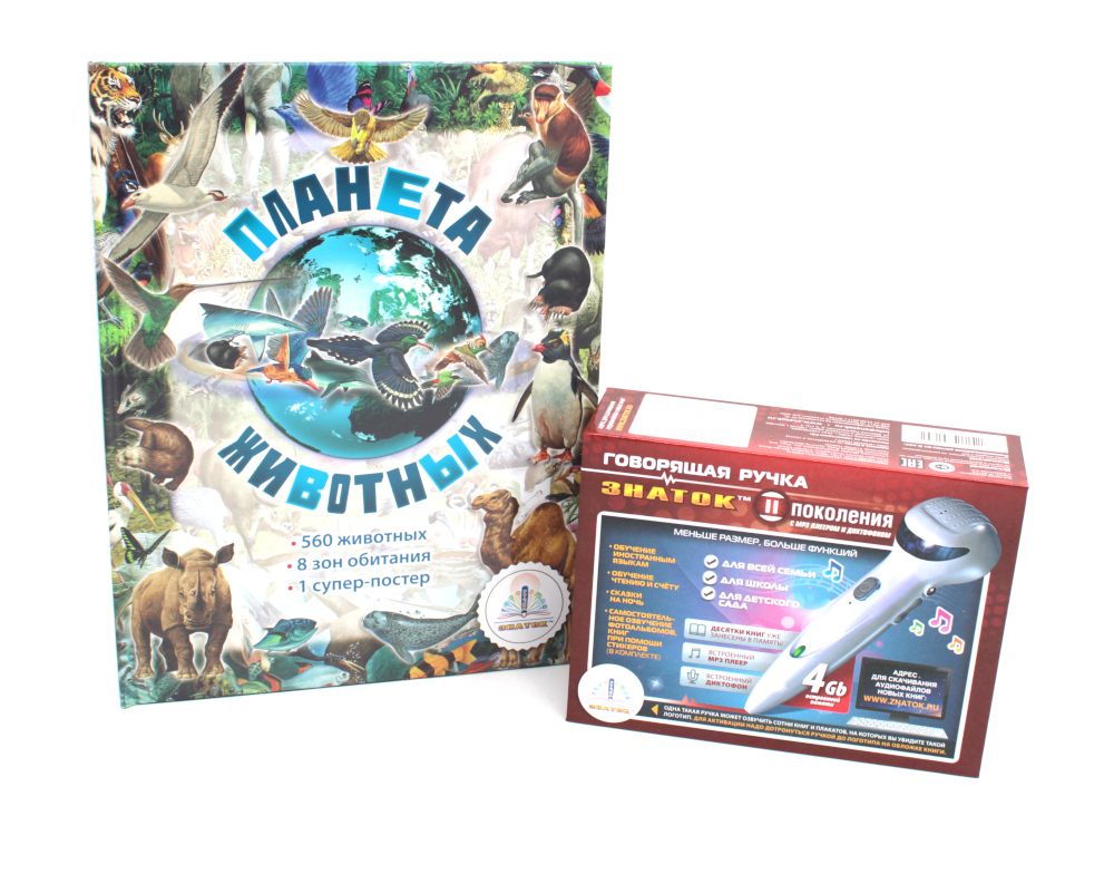Комплект из книги и говорящей ручки: «Планета животных» Об этой книге можно говорить только в превосходной форме - фантастические рисунки, познавательные тексты о 560 животных из всех уголков планеты, редчайшие звуки животных, огромный красочный постер, замечательные артисты, которые озвучивали эту книгу: Алексей Лысенков, Амаяк Акопян, Борис Грачевский, Иван Кокорин и многие другие! Книга получилась! Ручка II поколения 4GB Очень простая в использовании уникальная помощница, предназначенная для эффективного обучения иностранным языкам, как детей, так и взрослых. Она так же поможет обучить детей чтению и счёту, расскажет сказку на ночь, познакомит ребёнка с окружающим миром. Причём, ручка озвучивает не только слова, но и рисунки! Для превращения ручки в удивительного рассказчика и доброго учителя достаточно коснуться, расположенного на книге или плакате, вот такого логотипа > В память ручки (4 GB) уже внесены книги, указанные на обратной стороне коробки и в инструкции. Аудиофайлы других книг можно бесплатно скачать в разделе «Книги» или с информационного сайта www.books.znatok.ru, подсоединив выключенную ручку при помощи прилагаемого USB-кабеля к компьютеру. Если памяти будет не хватать, то файлы можно перенести из ручки в компьютер, и создать там свою библиотеку аудиофайлов, при необходимости закачивая их в ручку. Особого внимания заслуживают входящие в набор аудиостикеры и их применение.| Издательство | ЗНАТОК |