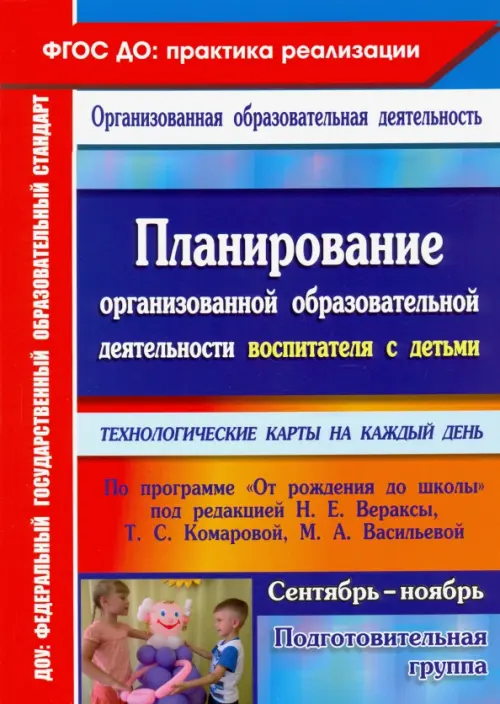 В пособии представлены технологические карты организованной образовательной деятельности для подготовительной группы, разработанные в соответствии с ФГОС ДО по примерной основной общеобразовательной программе дошкольного образования "От рождения до школы" под редакцией Н. Е. Вераксы, Т. С. Комаровой, М. А. Васильевой (М.: Мозаика-Синтез, 2014). Каждая технологическая карта содержит комплекс действий на уровне воспитателя по сопровождению деятельности детей и действий на уровне ребенка по освоению образовательных областей. Удобное табличное размещение материала позволяет педагогу обеспечить целостность, системность и эффективность всех направлений развития дошкольников, опираясь на целевые ориентиры дошкольного образования по формированию предпосылок учебной деятельности. Предназначено педагогам и руководителям ДОО, специалистам дошкольной педагогики; рекомендовано студентам высших и средних педагогических учебных заведений.