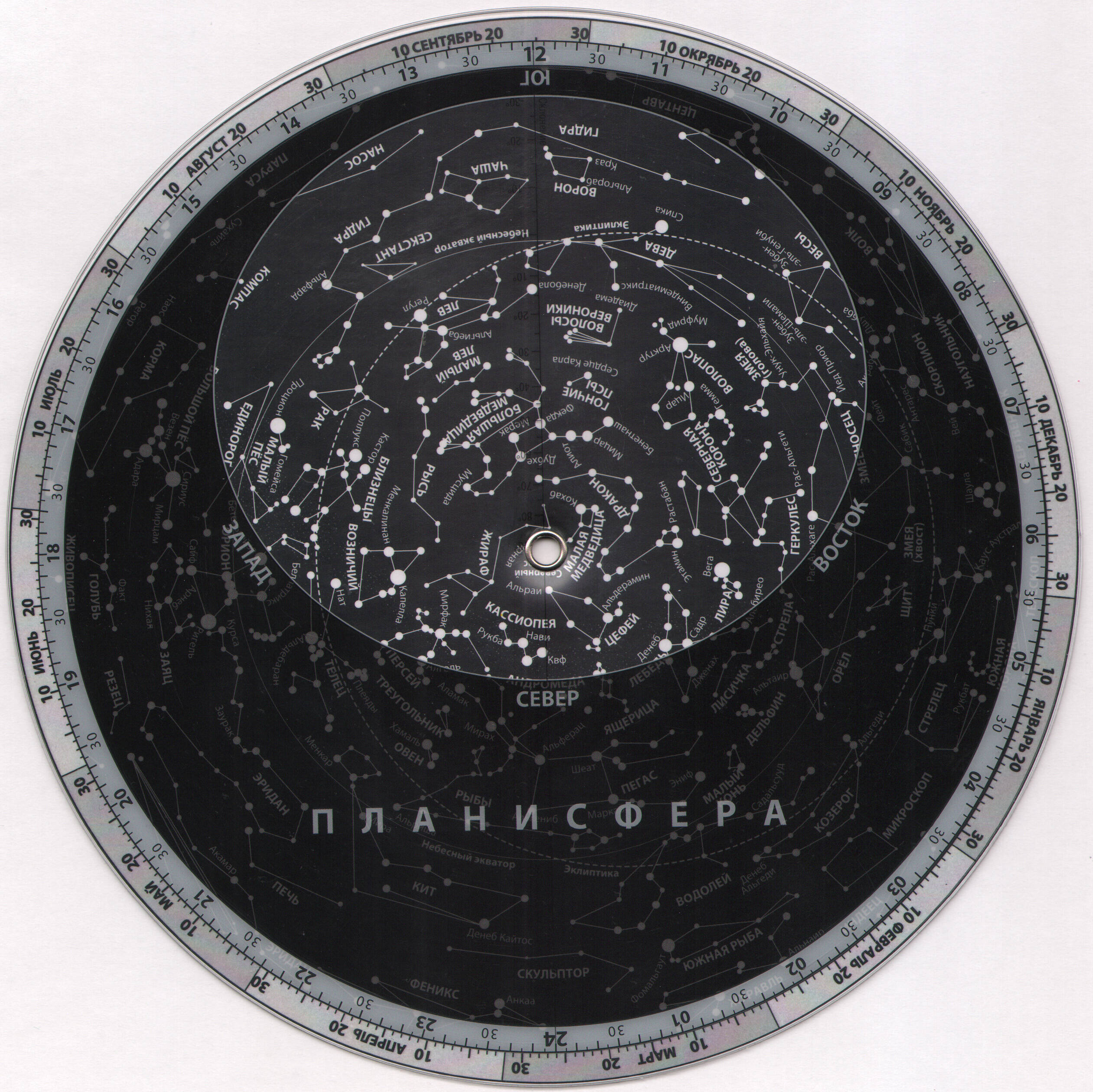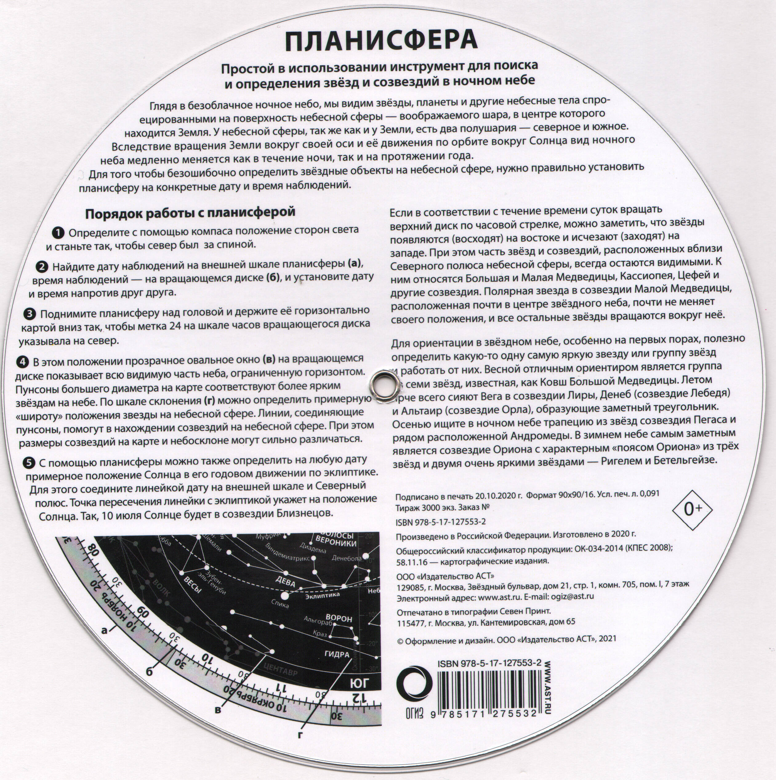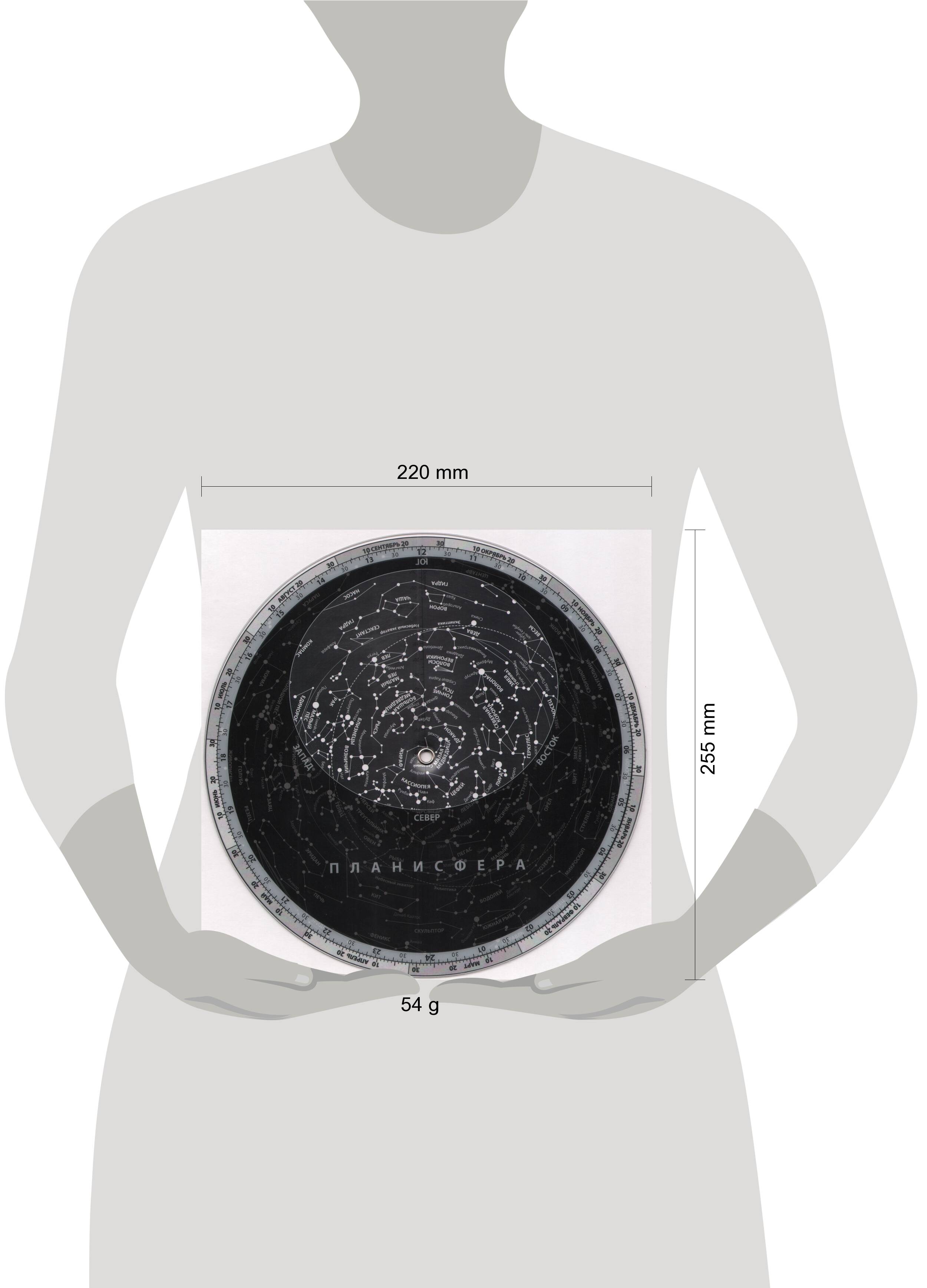 Планисфера - простой и удобный инструмент для наблюдения за звёздным небом. С её помощью можно на любую дату и время суток определить, какие именно звёзды и созвездия видны в небе, а также установить примерное положение Солнца в его годовом движении по эклиптике. На карте планисферы показаны звёзды вплоть до 5-й видимой звёздной величины в диапазоне склонения от +90 до -50 град. Чтобы увидеть участок ночного звёздного неба, видимый в вашей местности, достаточно сориентироваться по сторонам света и, вращая подвижный диск, установить требуемые дату и время наблюдений. Планисфера пригодна в качестве средства обучения для любого возраста, начиная с младшего школьного. Планисфера упакована в пакет из прозрачного пластика с еврослотом.| Издательство | ИЗДАТЕЛЬСТВО "АСТ" |