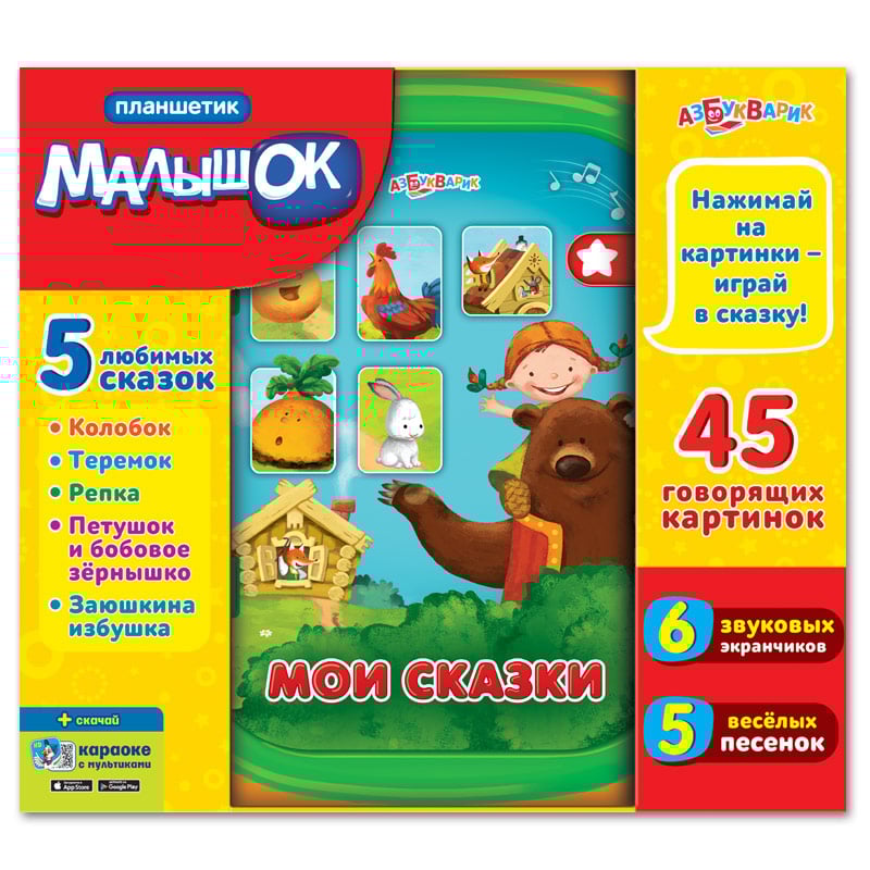 45 говорящих картинок, 6 звуковых экранчиков, 5 весёлых песенок и 5 любимых сказок - всё это вы найдете в новом планшетике «Мои сказки»!