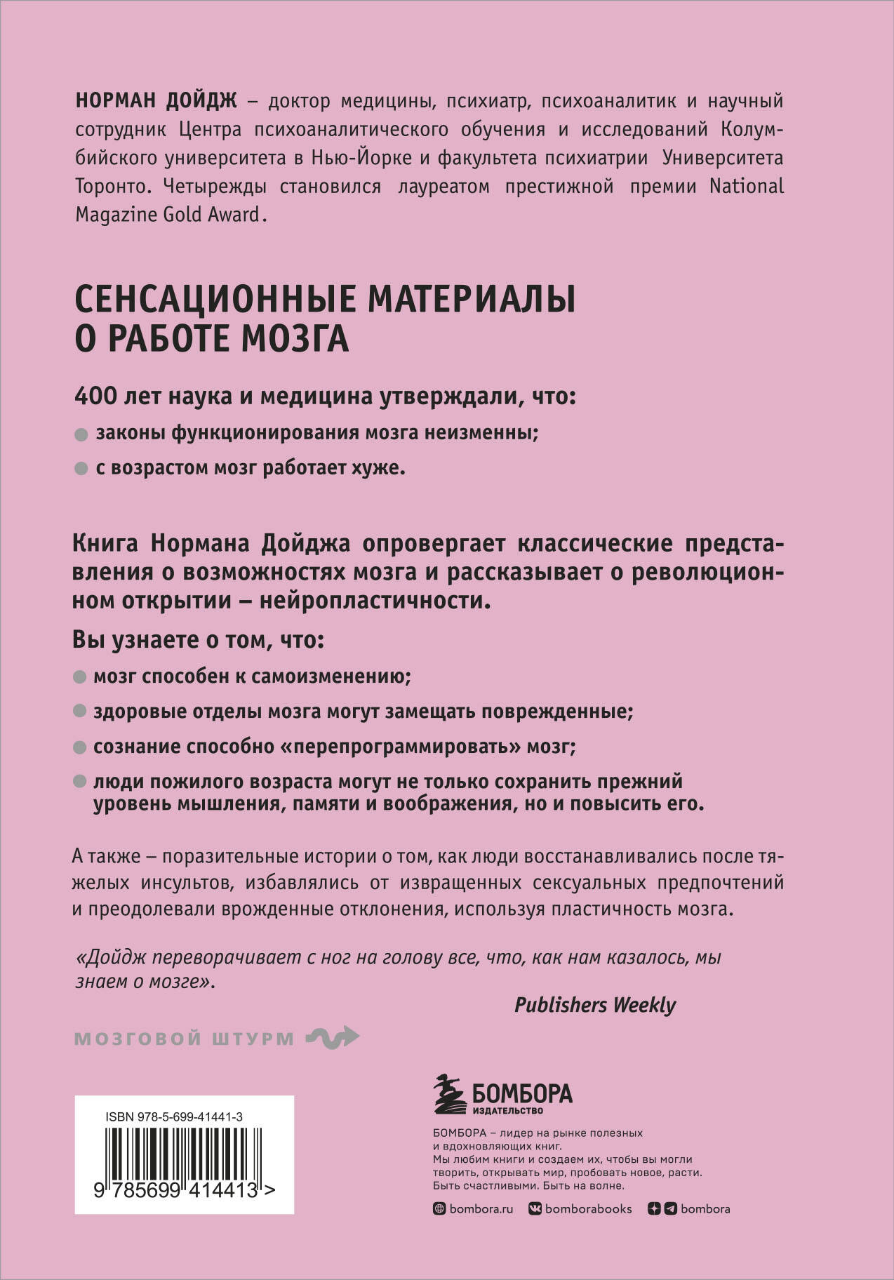 Норман Дойдж предлагает революционный взгляд на человеческий мозг. Он рассказывает о блестящих ученых, продвигающих пока еще новую науку о нейропластичности, и о поразительных успехах людей, жизнь которых они изменили, - примеры выздоровления пациентов, перенесших инсульт; случай женщины, имевшей от рождения половину мозга, который перепрограммировал сам себя для выполнения функций отсутствующей половины, истории преодоления необучаемости и эмоциональных нарушений, повышения уровня интеллекта и восстановления стареющего мозга. Методики, представленные в книге, будут интересны и полезны всем читателям.