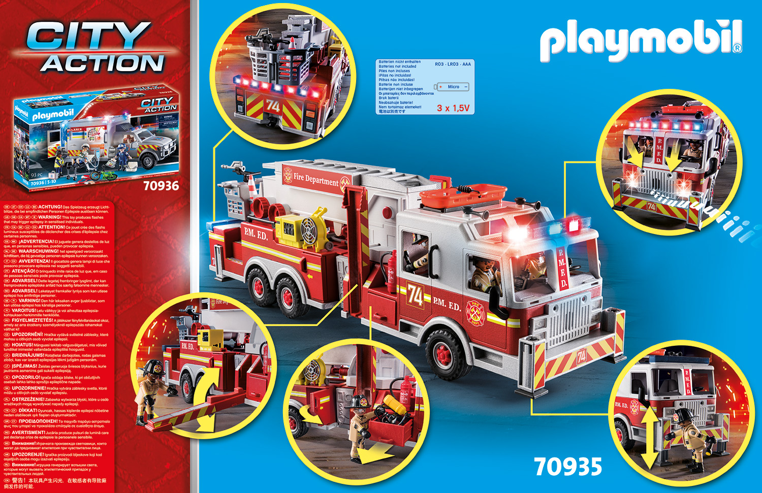 Никто не прибывает на место так быстро, как пожарная команда PLAYMOBIL. Имея хорошо оснащенную пожарную машину и современное оборудование, команда всегда готова тушить, помогать и спасать. С оригинальным американским звуком пожарной сирены, светом и работающей водометной пушкой! (требуются 3 микробатарейки по 1,5 В). Размеры: 20,8 х 5,5 х 6,2 дюйма (Д х Г х В)