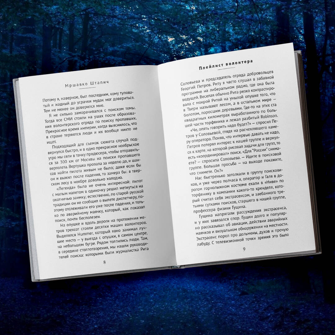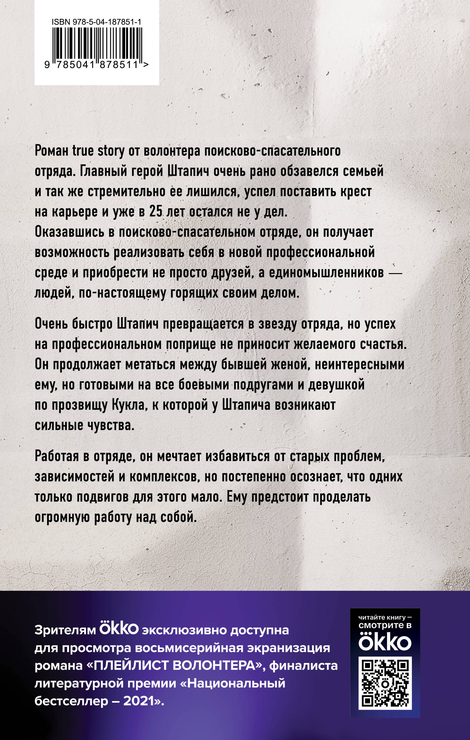 Роман-true story от участника поисково-спасательного отряда, финалист премии «Национальный бестселлер 2021». Главный герой Штапич очень рано обзавелся семьей и так же стремительно её лишился, успел поставить крест на карьере и уже в 25 лет остался не у дел. Оказавшись в поисково-спасательном отряде, он получает возможность реализовать себя в новой профессиональной среде и приобрести не просто друзей, а единомышленников ― людей, по-настоящему горящих своим делом. Очень быстро Штапич превращается в звезду отряда, но этот успех не приносит счастья. Он продолжает метаться между бывшей женой, неинтересными ему, но готовыми на все боевыми подругами и девушкой по прозвищу Кукла, к которой возникают сильные чувства. Работая в отряде, он мечтает избавиться от старых проблем, зависимостей и комплексов, но постепенно осознает, что одних только подвигов для этого мало. Ему предстоит проделать огромную работу над собой. Иван Янковский, исполнитель главной роли в сериале по книге «Плейлист волонтёра»: «Мой герой, Штапич, ― персонаж, как будто перекочевавший из "Отпуска в сентябре" и "Полетов во сне и наяву" сюда, в наше время, как герой Хабенского из "В движении", только немного в другом сеттинге».| Издательство | ООО "Издательство "Эксмо" |