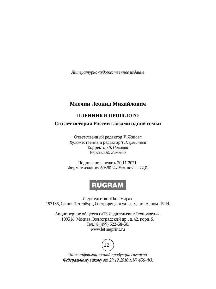 Леонид Михайлович Млечин - журналист в третьем поколении. На долю членов его семьи выпали нелегкие годы. В этой книге сквозь призму личных воспоминаний о минувшем рассказана история не только нашей страны, но и всего мира. Правдивое повествование о буднях таких редакций как «Литературная газета» и «Известия», о встречах с великими и ничтожными, о том, как делались и рушились карьеры. Книга о прошлом, пленниками которого по сей день остаются многие.| Издательство | Т8 RUGRAM |
