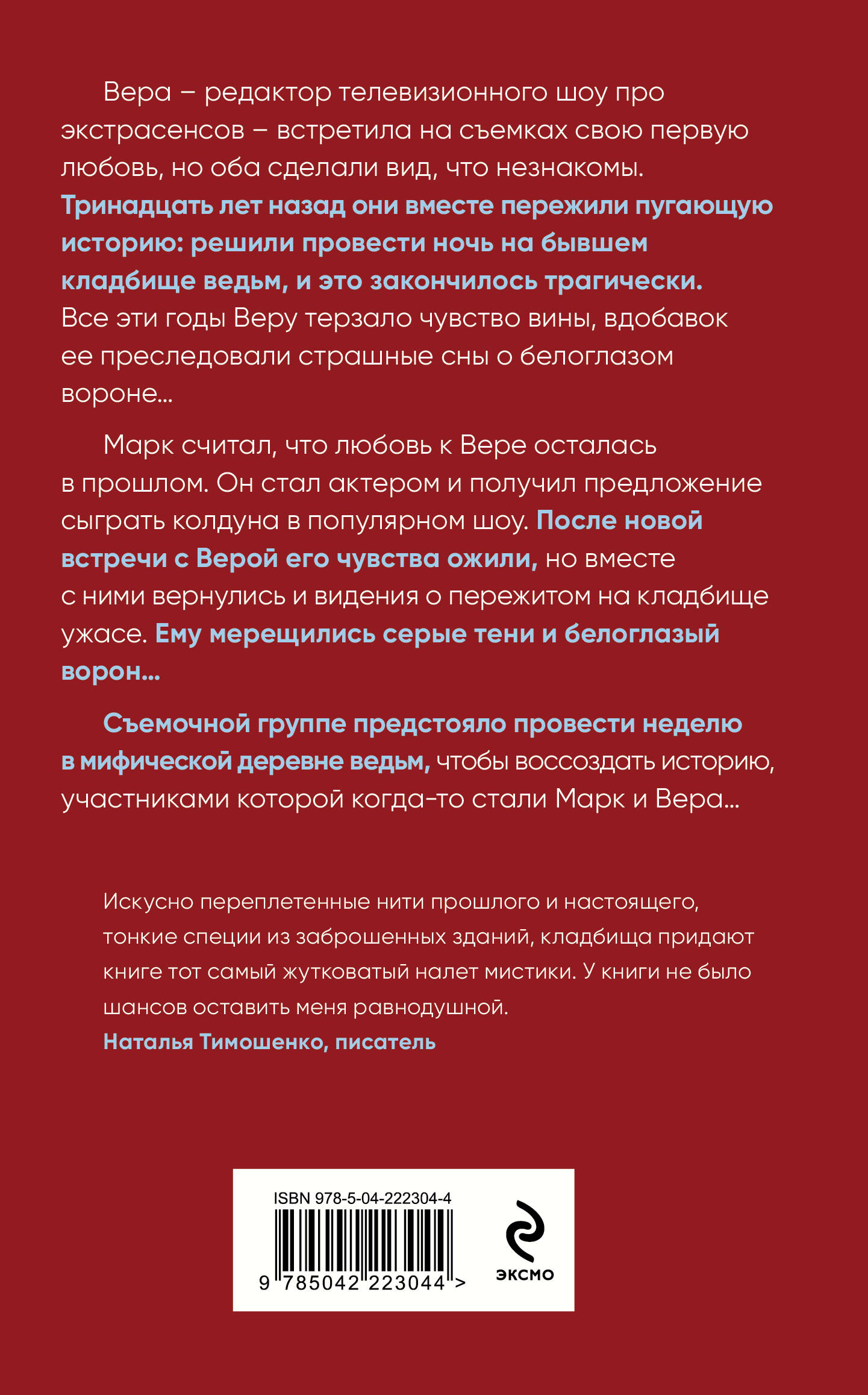 Вера - редактор телевизионного шоу про экстрасенсов - встретила на съемках свою первую любовь, но оба сделали вид, что незнакомы. Тринадцать лет назад они вместе пережили пугающую историю: решили провести ночь на бывшем кладбище ведьм, и это закончилось трагически. Все эти годы Веру терзало чувство вины, вдобавок ее преследовали страшные сны о белоглазом вороне… Марк считал, что любовь к Вере осталась в прошлом. Он стал актером и получил предложение сыграть колдуна в популярном шоу. После новой встречи с Верой его чувства ожили, но вместе с ними вернулись и видения о пережитом на кладбище ужасе. Ему мерещились серые тени и белоглазый ворон… Съемочной группе предстояло провести неделю в мифической деревне ведьм, чтобы воссоздать историю, участниками которой когда-то стали Марк и Вера… В мистических триллерах Александра Белова ведьма и сыщик объединяются, образуя интригующий дуэт, где она отвечает за мистическую сторону дела, а он - за материальную. Прошлое тесно связано с настоящим, воскрешая воспоминания о пугающих необъяснимых событиях. Только так можно понять их подоплеку и предотвратить возвращение кошмара...| Издательство | ООО "Издательство "Эксмо" |