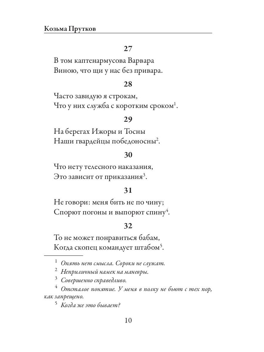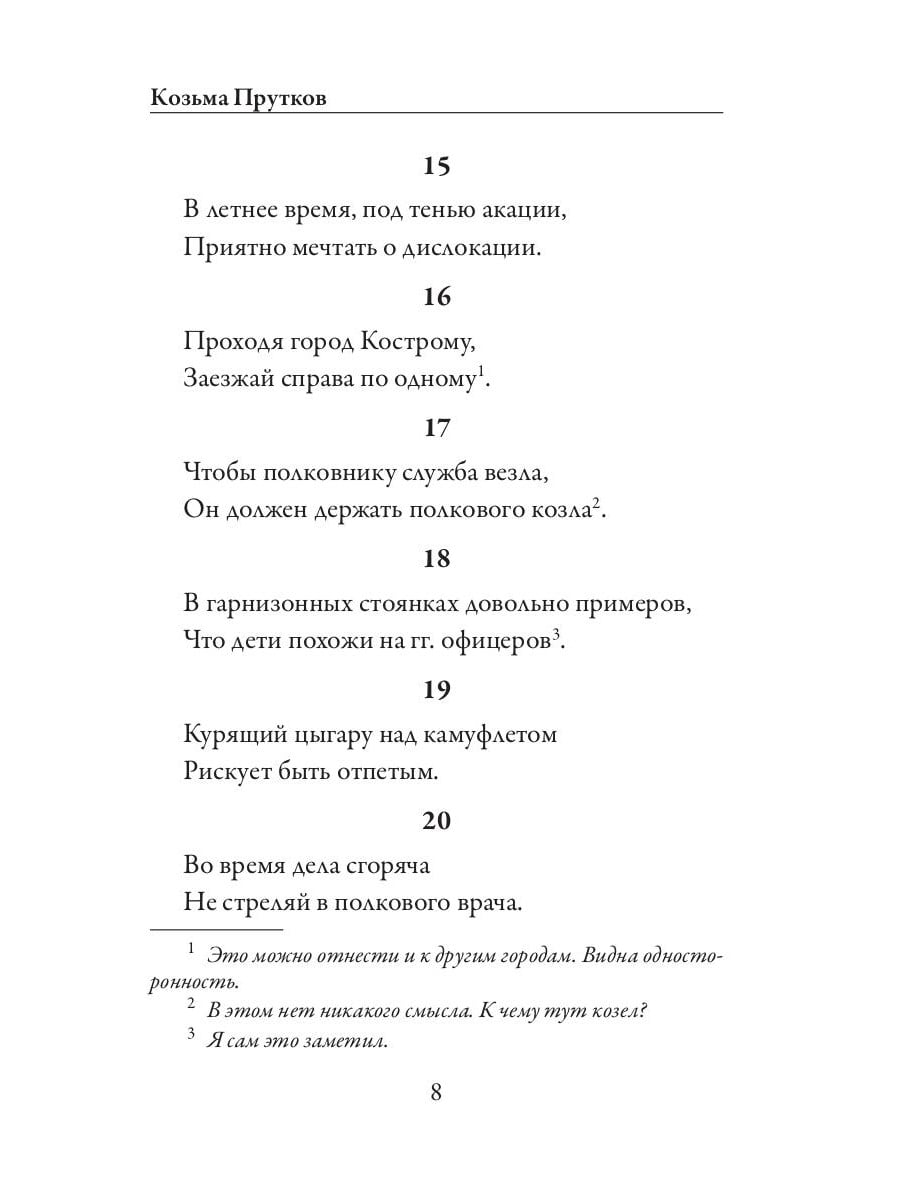 В издание вошли многообразные литературные опыты «проблемного» автора - Козьмы Пруткова: афоризмы, комедии и злободневные анекдоты. Почему «проблемный»? В 1850-60-е годы за литературной маской скрывались четыре автора - Алексей Толстой, Алексей, Владимир и Александр Жемчужниковы. Так на страницах журналов «Современник» и «Искра» возник во всем великолепии Козьма Прутков. Его острая сатира никого не оставит равнодушным.