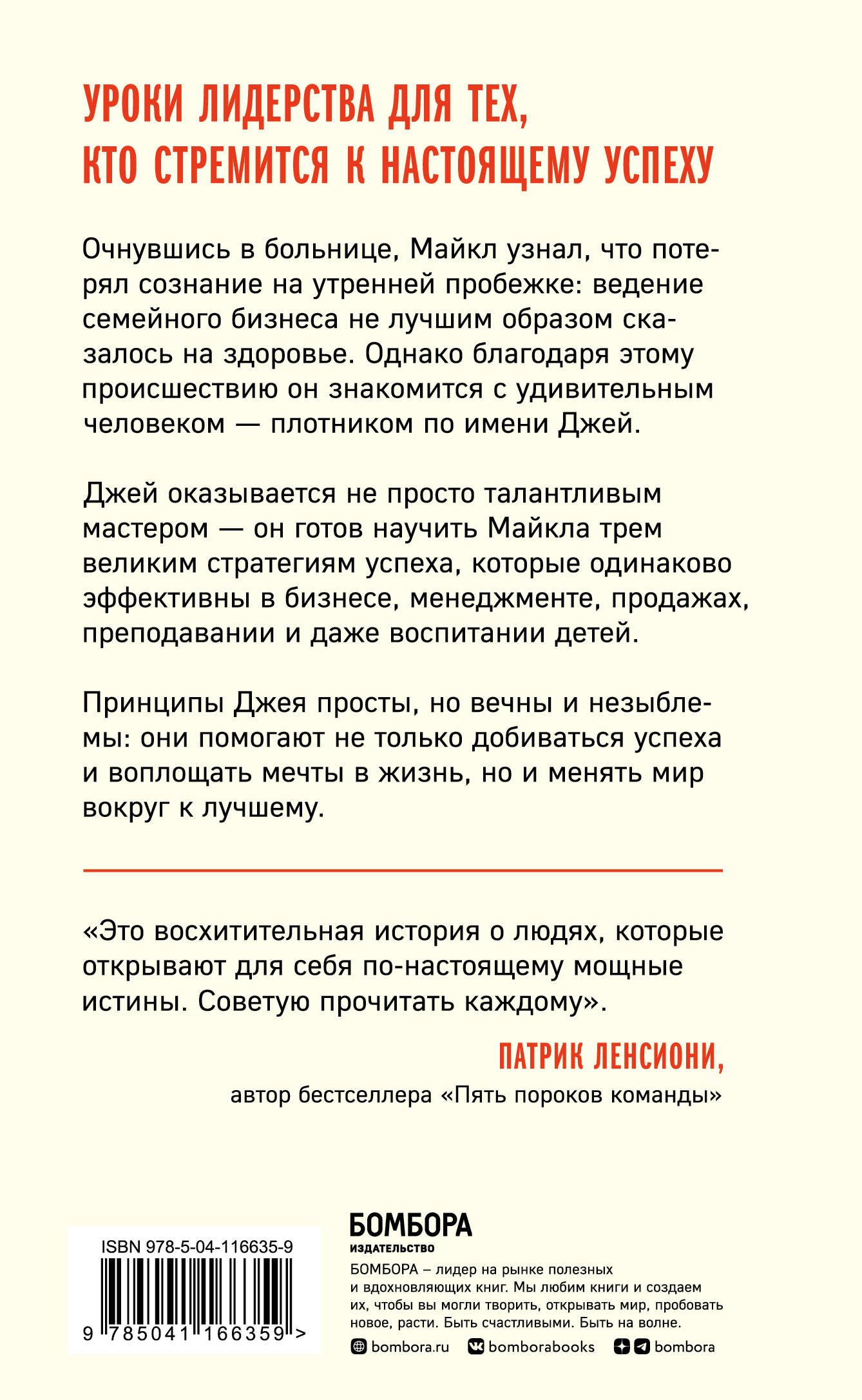 УРОКИ ЛИДЕРСТВА ДЛЯ ТЕХ, КТО СТРЕМИТСЯ К НАСТОЯЩЕМУ УСПЕХУ. Очнувшись в больнице, Майкл узнал, что потерял сознание на утренней пробежке: ведение семейного бизнеса не лучшим образом сказалось на здоровье. Однако благодаря этому происшествию он знакомится с удивительными человеком - плотником по имени Джей. Джей оказывается не просто талантливым мастером - он готов научить Майкла трем великим стратегиям успеха, которые одинаковы эффективны в бизнесе, менеджменте, продажах, преподавании и даже воспитании детей. Принципы Джея просты, но вечны и незыблемы: они помогают не только добиваться успеха и воплощать мечты в жизнь, но и менять мир вокруг к лучшему.| Издательство | ООО "Издательство "Эксмо" |
