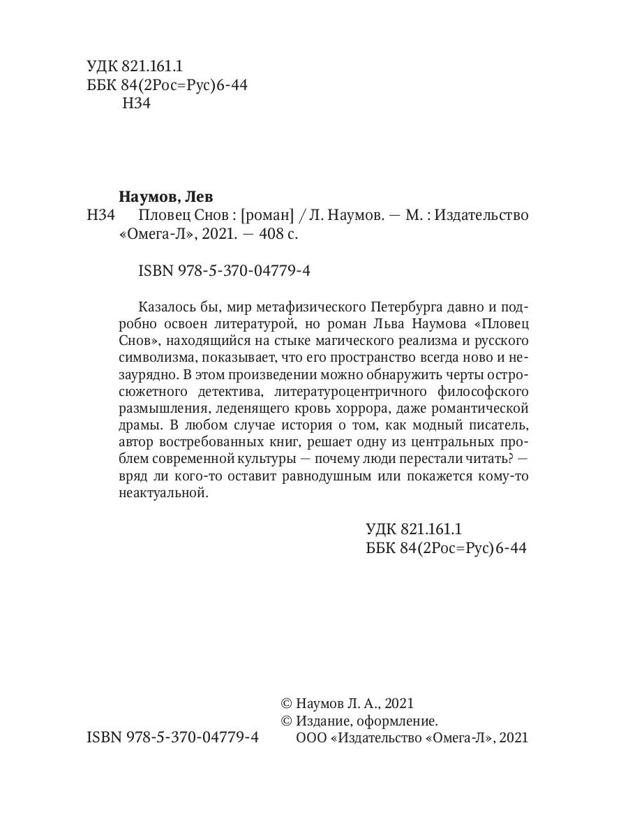 Казалось бы, мир метафизического Петербурга давно и подробно освоен литературой, но роман Льва Наумова «Пловец Снов», находящийся на стыке магического реализма и русского символизма, показывает, что его пространство всегда ново и незаурядно. В этом произведении можно обнаружить черты остросюжетного детектива, литературоцентричного философского размышления, леденящего кровь хоррора, даже романтической драмы. В любом случае история о том, как модный писатель, автор востребованных книг, решает одну из центральных проблем современной культуры - почему люди перестали читать? - вряд ли кого-то оставит равнодушным или покажется кому-то неактуальной.| Издательство | Омега-Л |