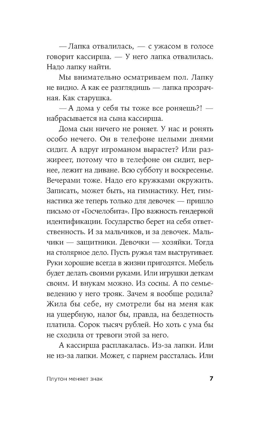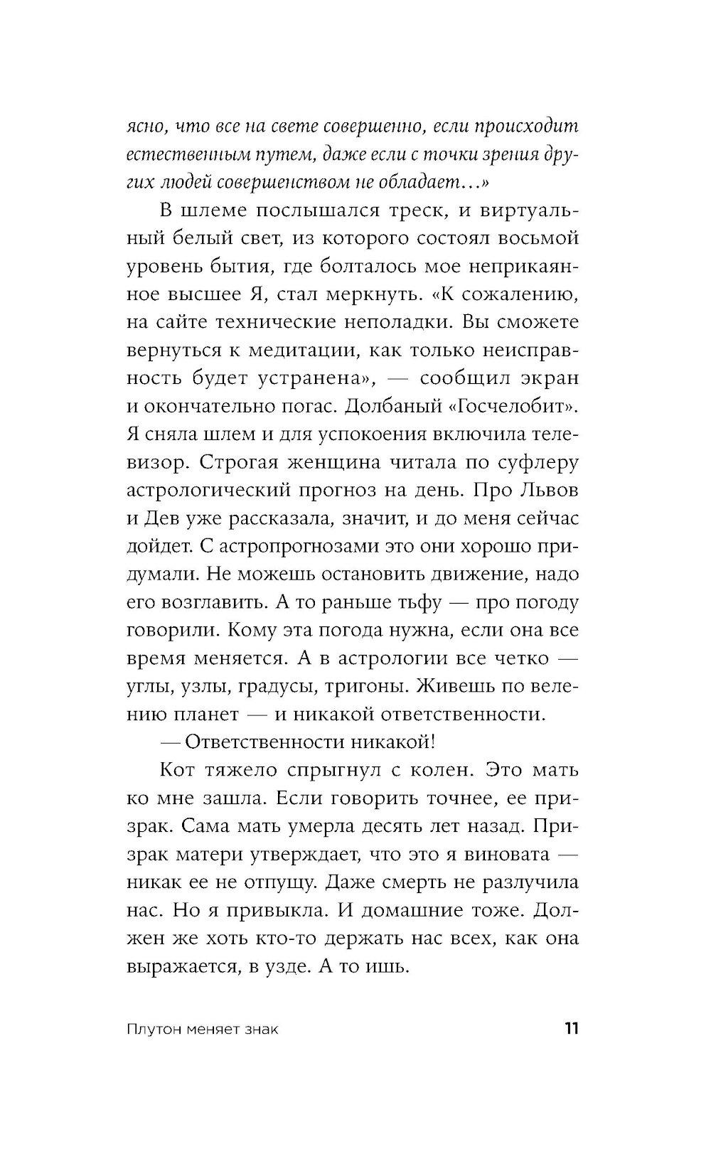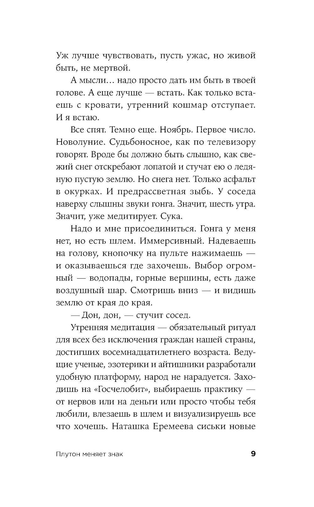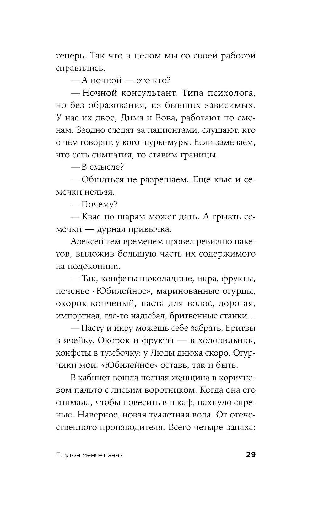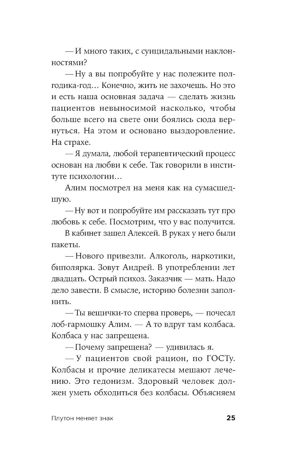 СОДЕРЖИТ ИНФОРМАЦИЮ О НАРКОТИЧЕСКИХ ИЛИ ПСИХОТРОПНЫХ ВЕЩЕСТВАХ, УПОТРЕБЛЕНИЕ КОТОРЫХ ОПАСНО ДЛЯ ЗДОРОВЬЯ. ИХ НЕЗАКОННЫЙ ОБОРОТ ВЛЕЧЕТ УГОЛОВНУЮ ОТВЕТСТВЕННОСТЬ. В мире, где каждый шаг регламентирован и больше нет свободного искусства, бывший издатель Анастасия становится клиническим психологом. Ее собственная реальность зыбка и сюрреалистична: в ее квартире живут бывший муж и призрак матери, ее пациенты одержимы нетривиальными зависимостями, ее окружение придает астрологии вес критической рациональности. Но даже в условиях тотального контроля налаженная система однажды дает сбой - и не только потому, что Плутон меняет знак, а значит, все неизбежно придут к всеобщей трансформации, как обещают по телевизору.