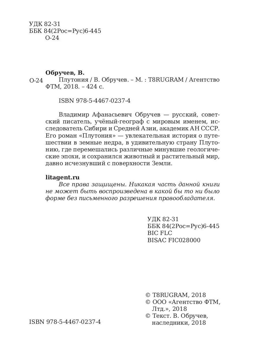 Владимир Афанасьевич Обручев - русский, советский писатель, учёный-географ с мировым именем, исследователь Сибири и Средней Азии, академик АН СССР. Его роман «Плутония» - увлекательная история о путешествии в земные недра, в удивительную страну Плутонию, где перемешались различные минувшие геологические эпохи, и сохранился животный и растительный мир, давно исчезнувший с поверхности Земли.