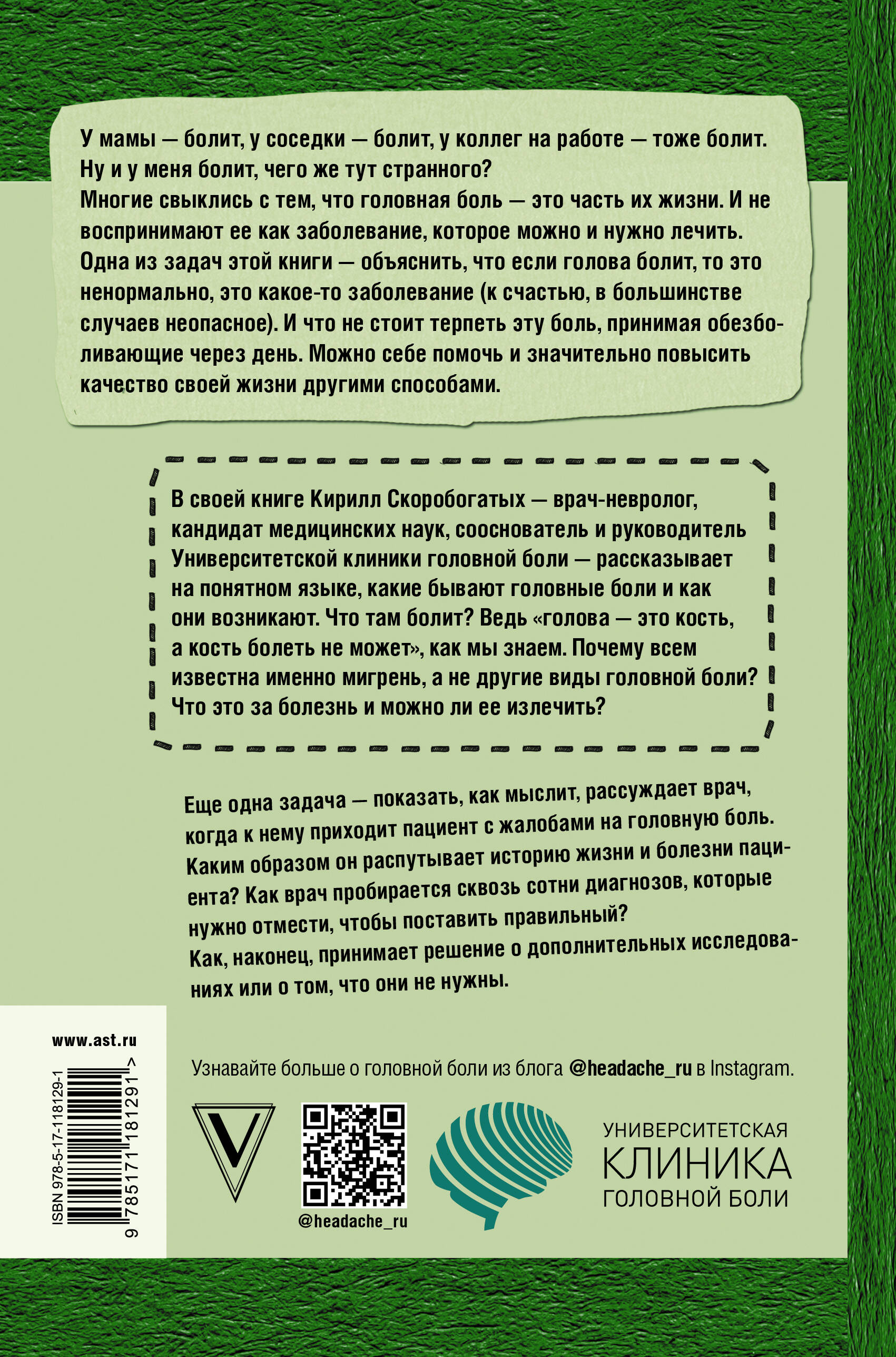 Книга невролога, цефалголога (специалиста по диагностике и лечению различных видов головной боли) Кирилла Скоробогатых поможет разобраться с мигренью и ее причинами. А систематическое заполнение дневника головной боли, который вы найдете в этой книге, позволит контролировать свое состояние и предоставить максимально полную информацию вашему лечащему врачу для постановки точного диагноза.| Издательство | Издательство "АСТ" |