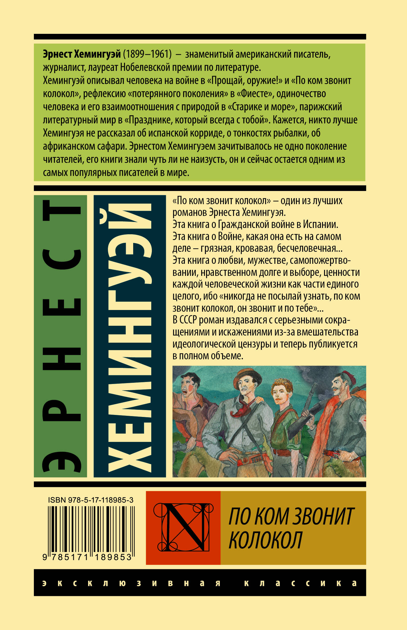 "По ком звонит колокол" - один из лучших романов Эрнеста Хемингуэя. Эта книга о гражданской войне в Испании. Эта книга о Войне, какая она есть на самом деле - грязная, кровавая, бесчеловечная… Эта книга о любви, мужестве, самопожертвовании, нравственном долге и выборе, ценности каждой человеческой жизни как части единого целого, ибо "никогда не посылай узнать по ком звонит колокол, он звонит и по тебе"… В СССР роман издавался с серьезными сокращениями и искажениями из-за вмешательства идеологической цензуры и теперь публикуется в полном объеме.| Издательство | Издательство "АСТ" |