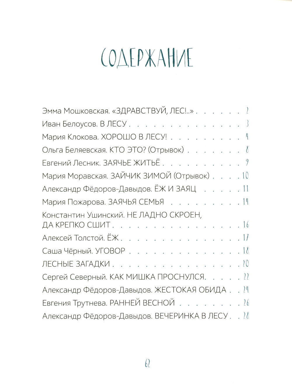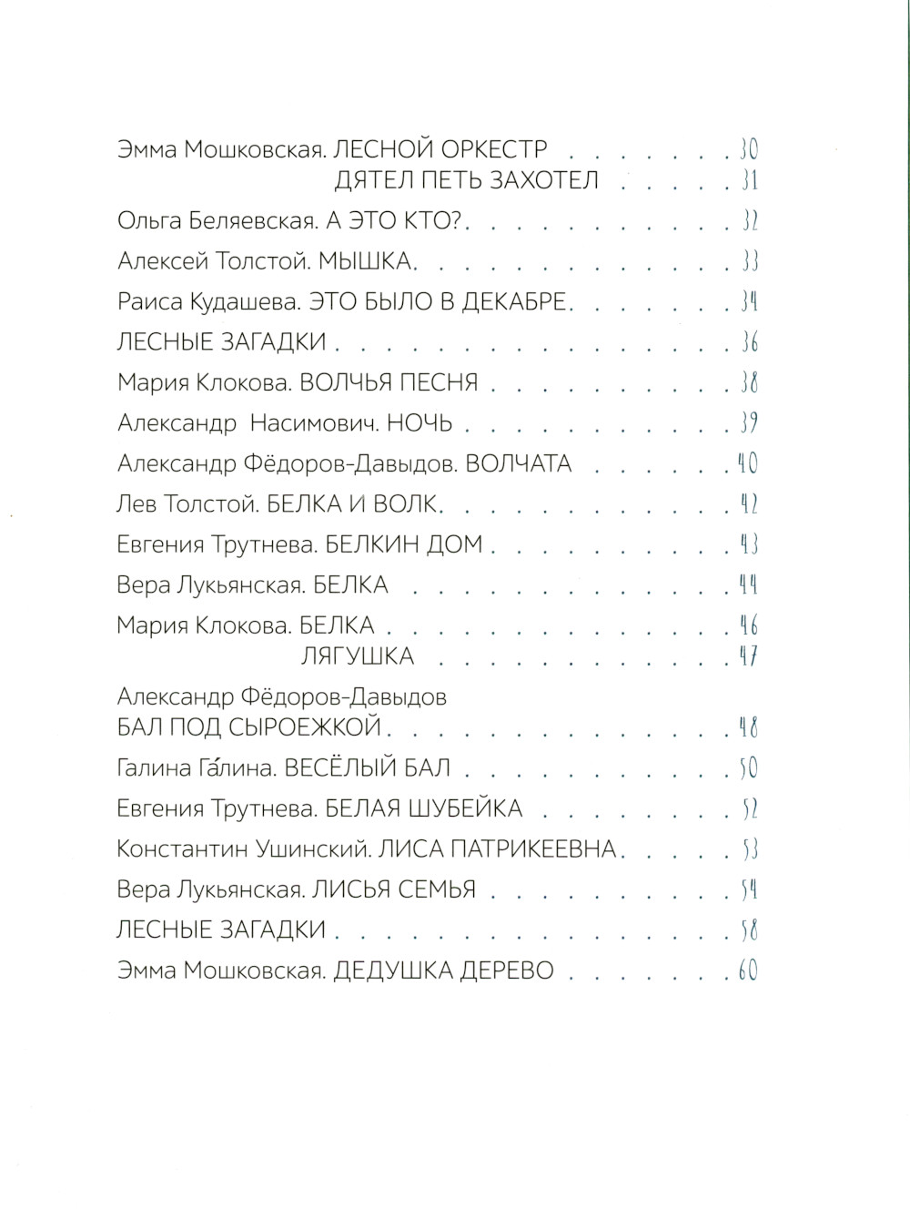 В этой книге замечательные русские поэты и писатели рассказывают детям о жизни леса, внешнем облике и повадках животных, учат бережно и с уважением относиться ко всему живому. А тем ребятам, которые познакомятся с героями книги поближе, будет интересно разгадать лесные загадки.