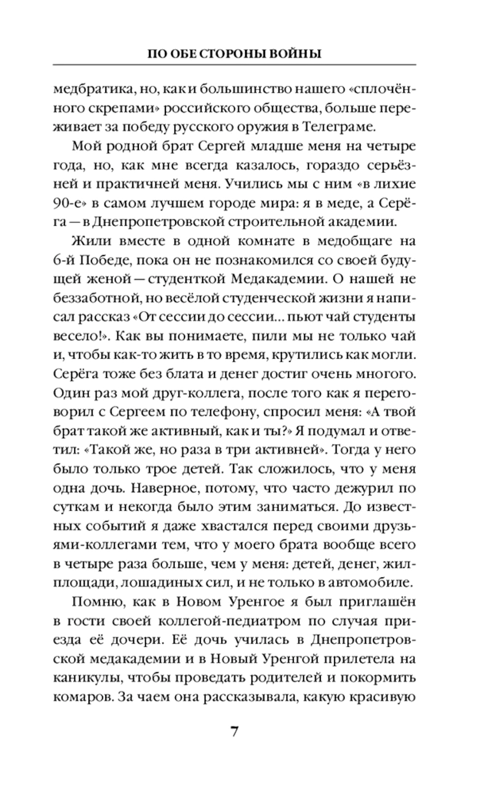 Константин Юрьевич Леушин - врач анестезиолог-реаниматолог с 20-летним стажем, уроженец Красного Лимана Донецкой области, закончивший медицинскую академию в Днепропетровске, а с 2002 года живет и работает в России в отделении кардиохирургической реанимации и интенсивной терапии одного из лучших Федеральных Медицинских Центров. В составе отряда Центра Медицины Катастроф и медицинского отряда Группы Вагнер, Константин оказывал помощь военным и мирным людям на Донбассе и в приграничных областях: Мариуполь, Луганск, Шебекино, Бахмут. За каждым из этих названий - пыль, кровь, пороховой дым и прожекторы операционных, где врачи не только спасали жизни людей, но и сами часто находились на волосок от смерти. В этой книге вы найдёте целую жизнь - разорванная войной семья, одна часть которой ненавидит другую; старик-отец, дети которого оказались по обе стороны войны; бесконечный, невидимый для большинства подвиг врачей, жесткий врачебный юмор и мягкость южнорусской природы. Повествование заводит читателя то в прифронтовой Красный Лиман, то в послевоенный Мариуполь, то в меловые катакомбы Бахмута прямо во время штурма, где каждый человек - целый мир, а каждая операция - это яростная битва за жизнь в 10 минутах езды от линии смерти. Свидетельства очевидцев, яркие персонажи и совершенно особенный стиль повествования - всё это в книге Константина Леушина «По обе стороны войны».| Издательство | Яуза |