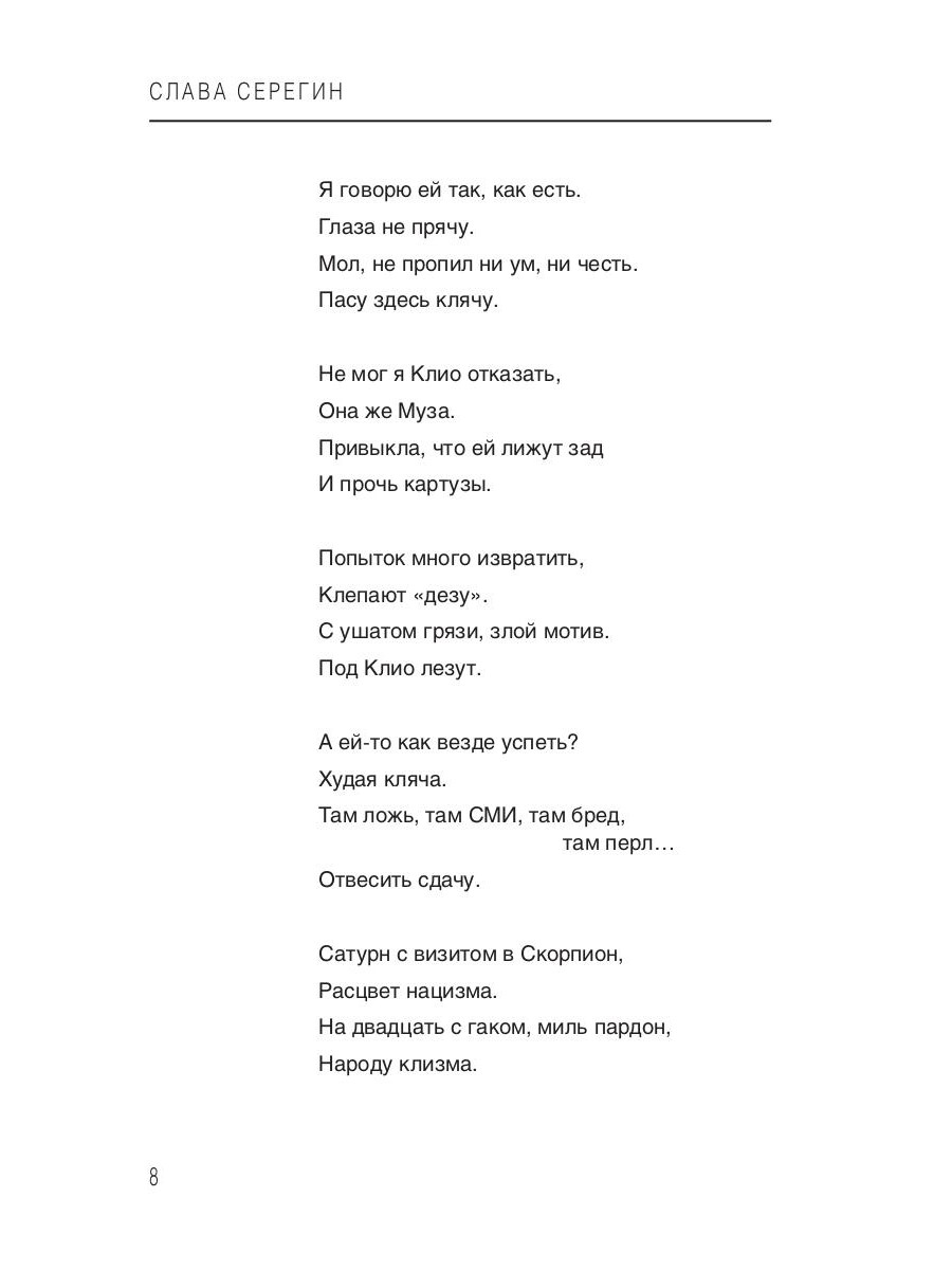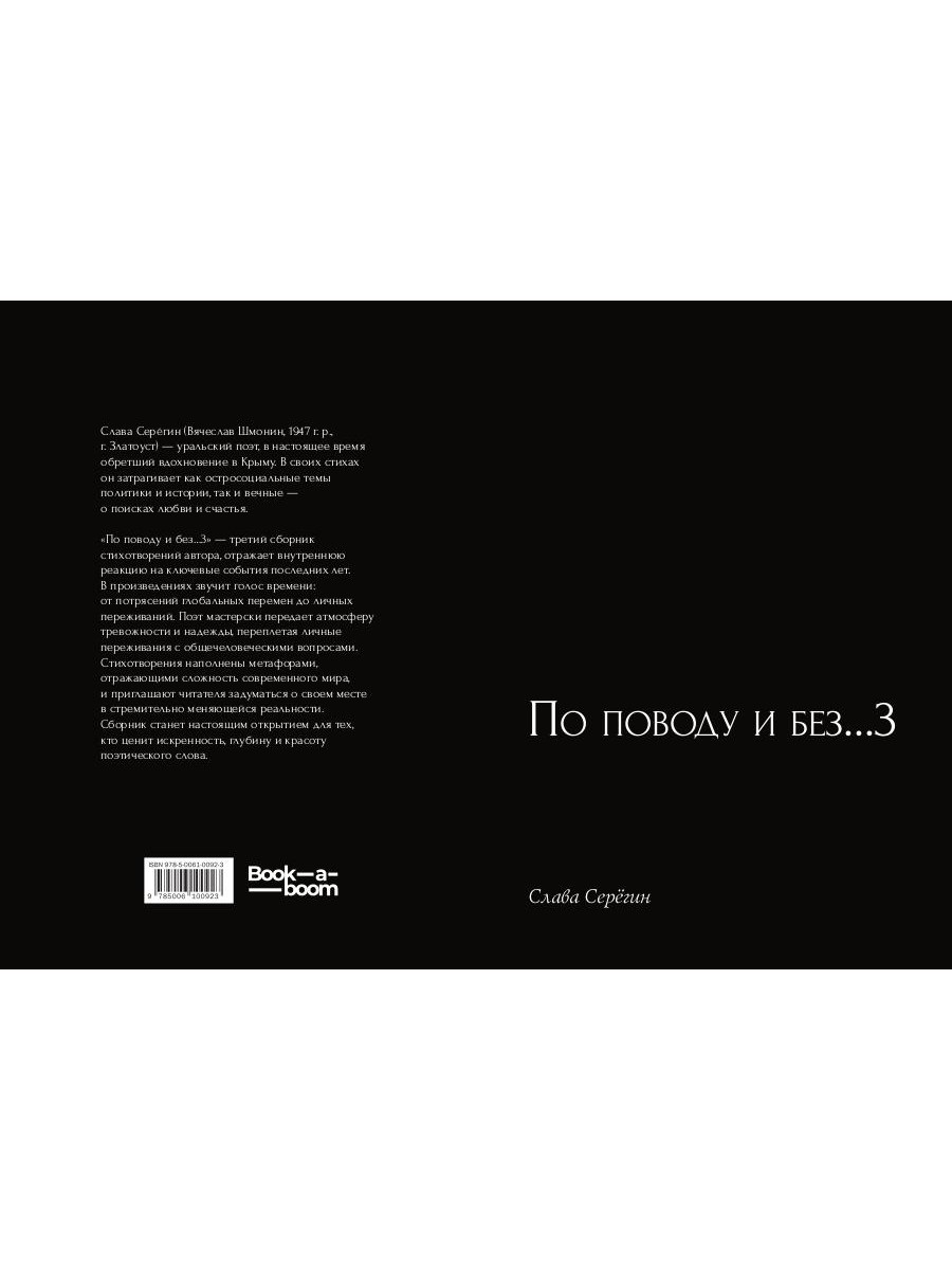 Слава Серёгин (Вячеслав Шмонин, 1947 г. р., г. Златоуст) - уральский поэт, в настоящее время обретший вдохновение в Крыму. В своих стихах он затрагивает как остросоциальные темы политики и истории, так и вечные - о поисках любви и счастья. «По поводу и без…3» - третий сборник стихотворений автора, отражает внутреннюю реакцию на ключевые события последних лет. В произведениях звучит голос времени: от потрясений глобальных перемен до личных переживаний. Поэт мастерски передает атмосферу тревожности и надежды, переплетая личные переживания с общечеловеческими вопросами. Стихотворения наполнены метафорами, отражающими сложность современного мира, и приглашают читателя задуматься о своем месте в стремительно меняющейся реальности. Сборник станет настоящим открытием для тех, кто ценит искренность, глубину и красоту поэтического слова.| Издательство | Т8 RUGRAM |