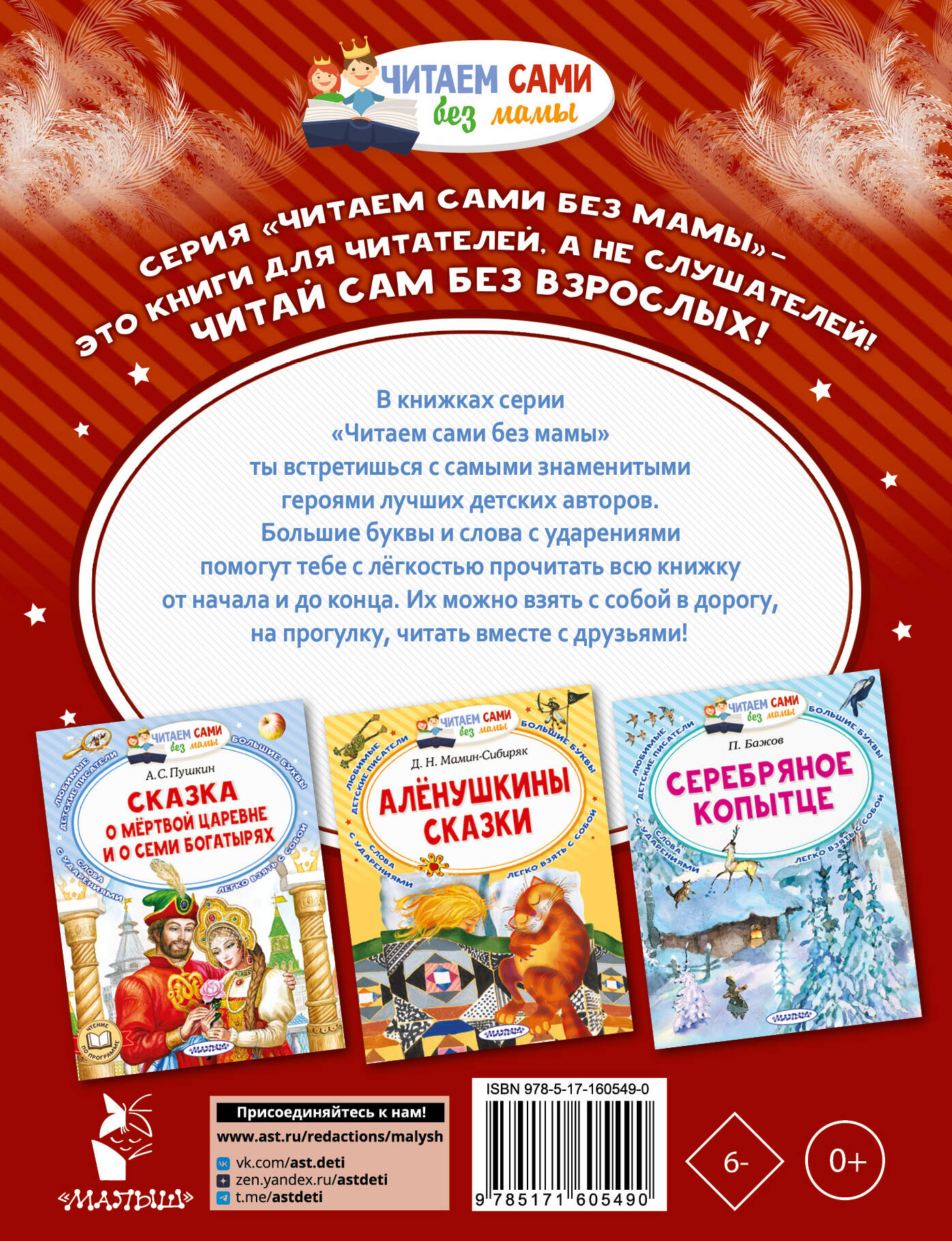 Книги серии «Читаем сами без мамы» - это уникальное собрание золотого фонда отечественной литературы! Сказки, стихи рассказы с красочными иллюстрациями понравятся каждому малышу! Все произведения серии входят в обязательную программу по чтению, а крупный шрифт и ударения помогут ребёнку самостоятельно познакомиться с шедеврами детской мировой литературы. В этой книге юные читатели прочитают знаменитые русские народные сказки. Вместе с героями истории ребята поймают волшебную щуку, посмеются над Иванушкой-дурачком и перехитрят глупого волка. Лучший подарок для юного читателя! Читайте с пользой и удовольствием!| Издательство | Издательство "АСТ" |