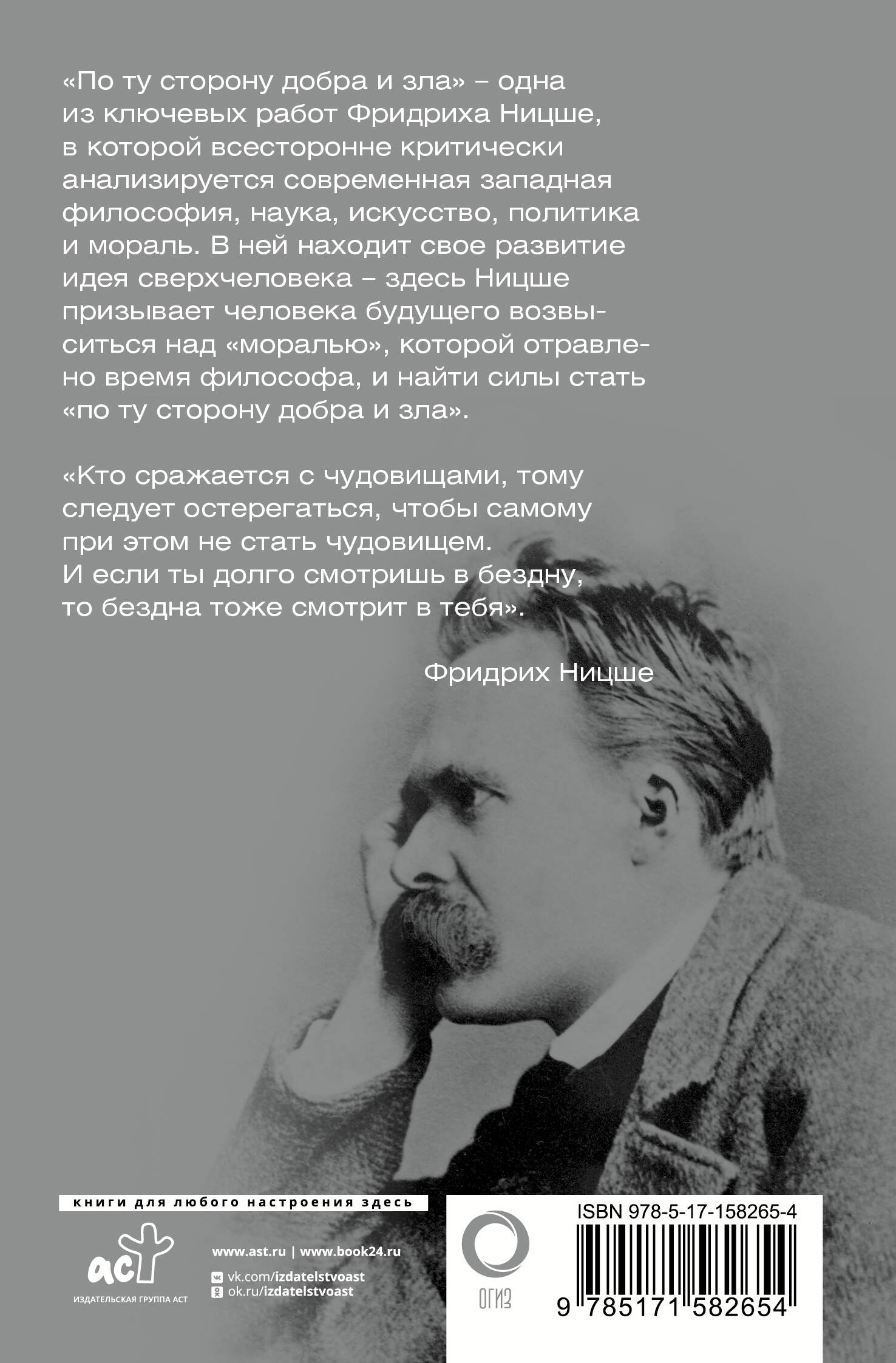 В своем произведении "По ту сторону добра и зла" Фридрих Ницше при помощи афоризмов критикует философию, искусство, науку и мораль, предвещая социальные и духовные катастрофы ХХ века. При этом он стремится сформулировать принципы нового нравственного поведения, которое все же остается моральным.| Издательство | ИЗДАТЕЛЬСТВО "АСТ" |