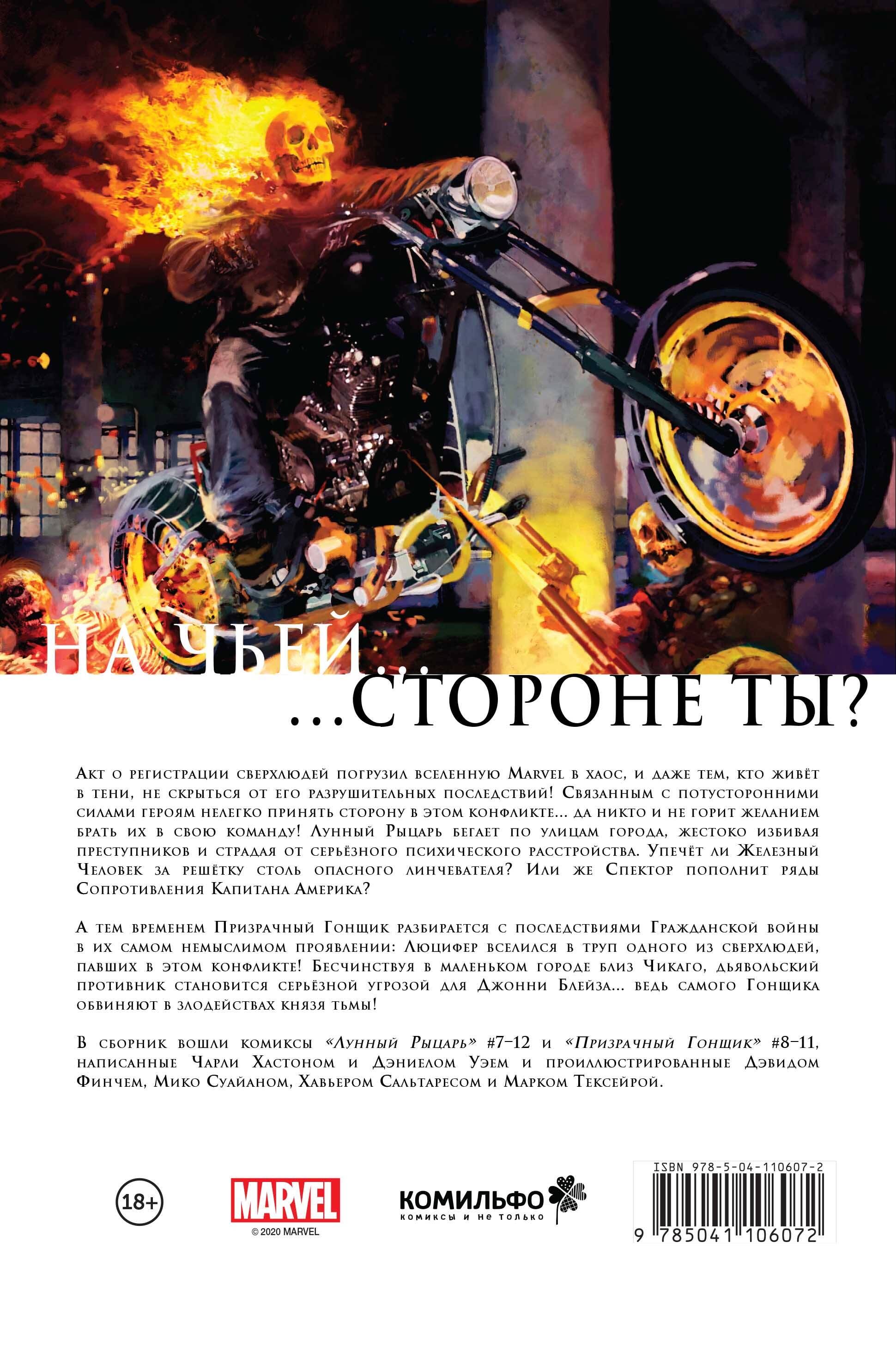Акт о регистрации сверхлюдей погрузил вселенную Marvel в хаос, и даже тем, кто живёт в тени, не скрыться от его разрушительных последствий! Связанным с потусторонними силами героям нелегко принять сторону в этом конфликте... да никто и не горит желанием брать их в свою команду! Лунный Рыцарь бегает по улицам города, жестоко избивая преступников и страдая от серьёзного психического расстройства. Упечёт ли Железный Человек за решётку столь опасного линчевателя? Или же Спектор пополнит ряды Сопротивления Капитана Америка? А тем временем Призрачный Гонщик разбирается с последствиями Гражданской войны в их самом немыслимом проявлении: Люцифер вселился в труп одного из сверхлюдей, павших в этом конфликте! Бесчинствуя в маленьком городе близ Чикаго, дьявольский противник становится серьёзной угрозой для Джонни Блейза... ведь самого Гонщика обвиняют в злодействах князя тьмы! Комиксы про Лунного Рыцаря и Призрачного Гонщика незаслуженно обделены вниманием отечественными издательствами, но каждое их появление на рынке - настоящий праздник для поклонников, а сейчас праздник вдвойне, ведь оба героя ждут вас под одной обложкой! Да и ещё и их приключения разворачиваются на фоне одного из важнейших событий в истории Marvel! Взрывная смесь из мистики, насилия, психических расстройств и зубодробительного экшена покажет вам, что по ту сторону Гражданской войны схватка шла не менее яростно, чем на передовой!| Издательство | ООО "Издательство "Эксмо" |