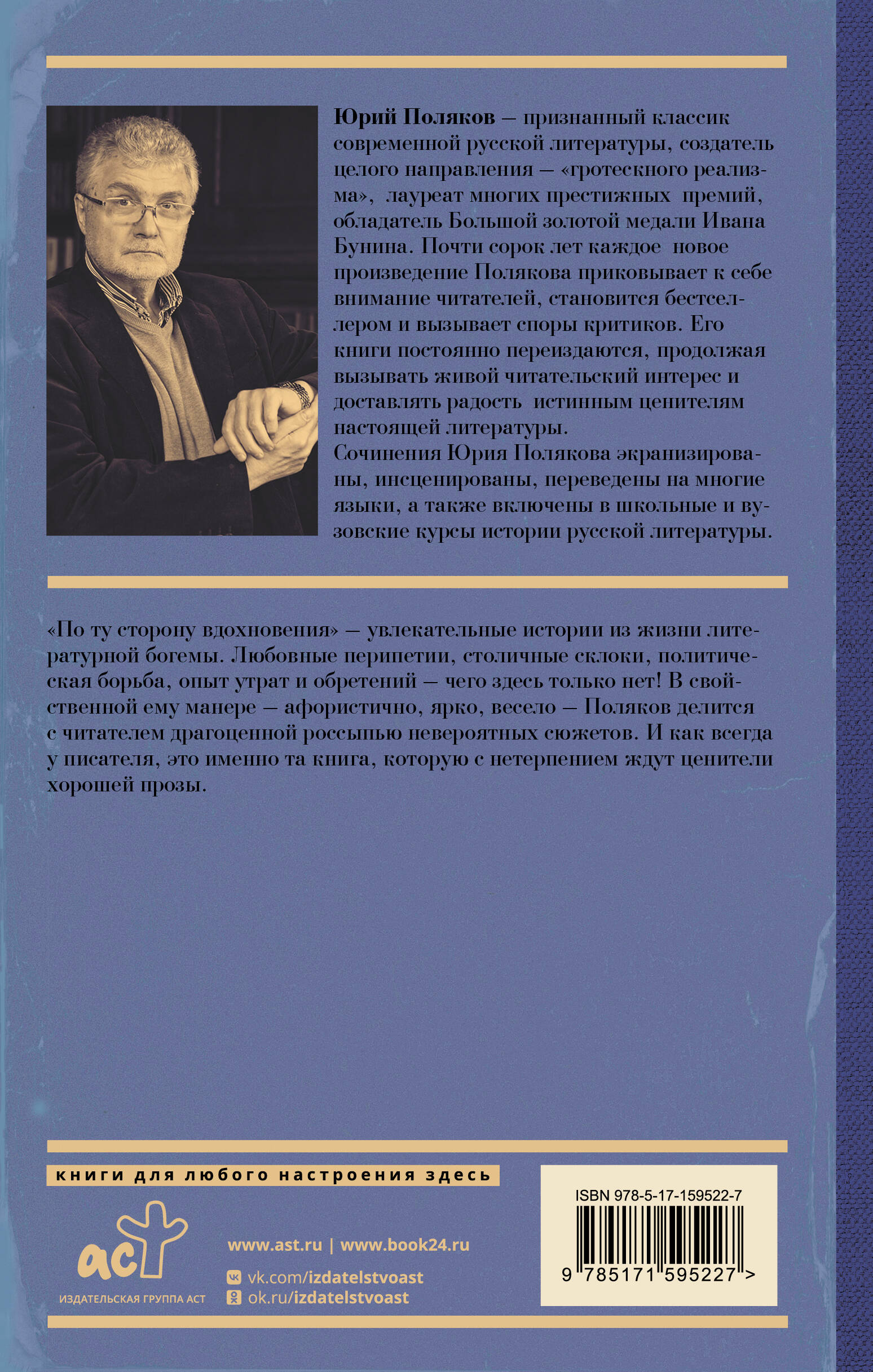 "По ту сторону вдохновения" - увлекательные истории из жизни литературной богемы. Любовные перипетии, столичные склоки, политическая борьба, опыт утрат и обретений - чего здесь только нет! В свойственной ему манере - афористично, ярко, весело - Поляков делится с читателем драгоценной россыпью невероятных сюжетов. И как всегда у писателя, это именно та книга, которую с нетерпением ждут ценители хорошей прозы.| Издательство | Издательство "АСТ" |