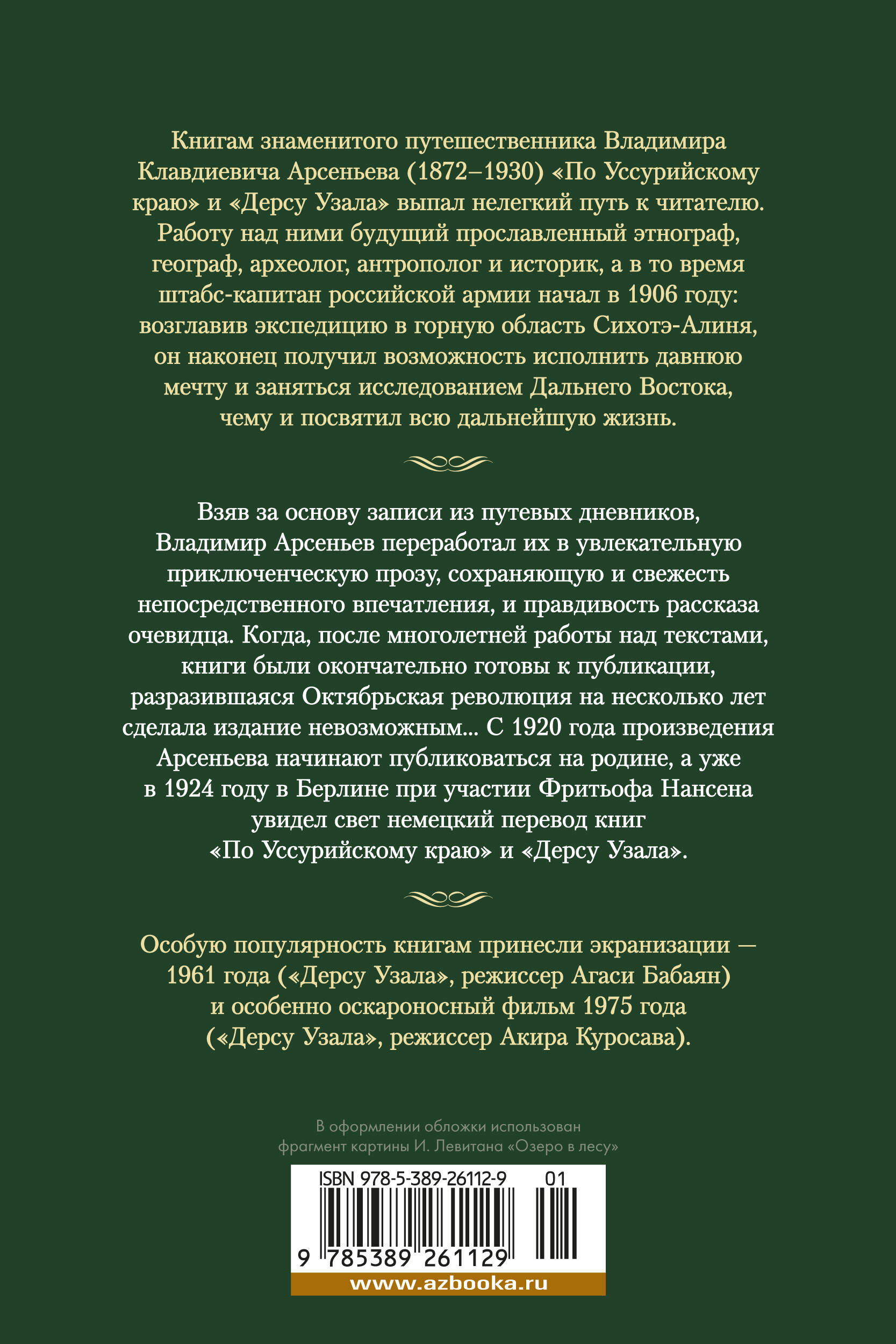 Книгам знаменитого путешественника Владимира Клавдиевича Арсеньева (1872-1930) "По Уссурийскому краю" и "Дерсу Узала" выпал нелегкий путь к читателю. Работу над ними будущий прославленный этнограф, географ, археолог, антрополог и историк, а в то время штабс-капитан российской армии начал в 1906 году: возглавив экспедицию в горную область Сихотэ-Алиня, он наконец получил возможность исполнить давнюю мечту и заняться исследованием Дальнего Востока, чему и посвятил всю дальнейшую жизнь. Взяв за основу записи из путевых дневников, Владимир Арсеньев переработал их в увлекательную приключенческую прозу, сохраняющую и свежесть непосредственного впечатления, и правдивость рассказа очевидца. Когда, после многолетней работы над текстами, книги были окончательно готовы к публикации, разразившаяся Октябрьская революция на несколько лет сделала издание невозможным... С 1920 года произведения Арсеньева начинают публиковаться на родине, а уже в 1924 году в Берлине при участии Фритьофа Нансена увидел свет немецкий перевод книг "По Уссурийскому краю" и "Дерсу Узала". Особую популярность книгам принесли экранизации - 1961 года ("Дерсу Узала", режиссер Агаси Бабаян) и особенно оскароносный фильм 1975 года ("Дерсу Узала", режиссер Акира Куросава).| Издательство | Азбука-Аттикус Издат.группа ООО |