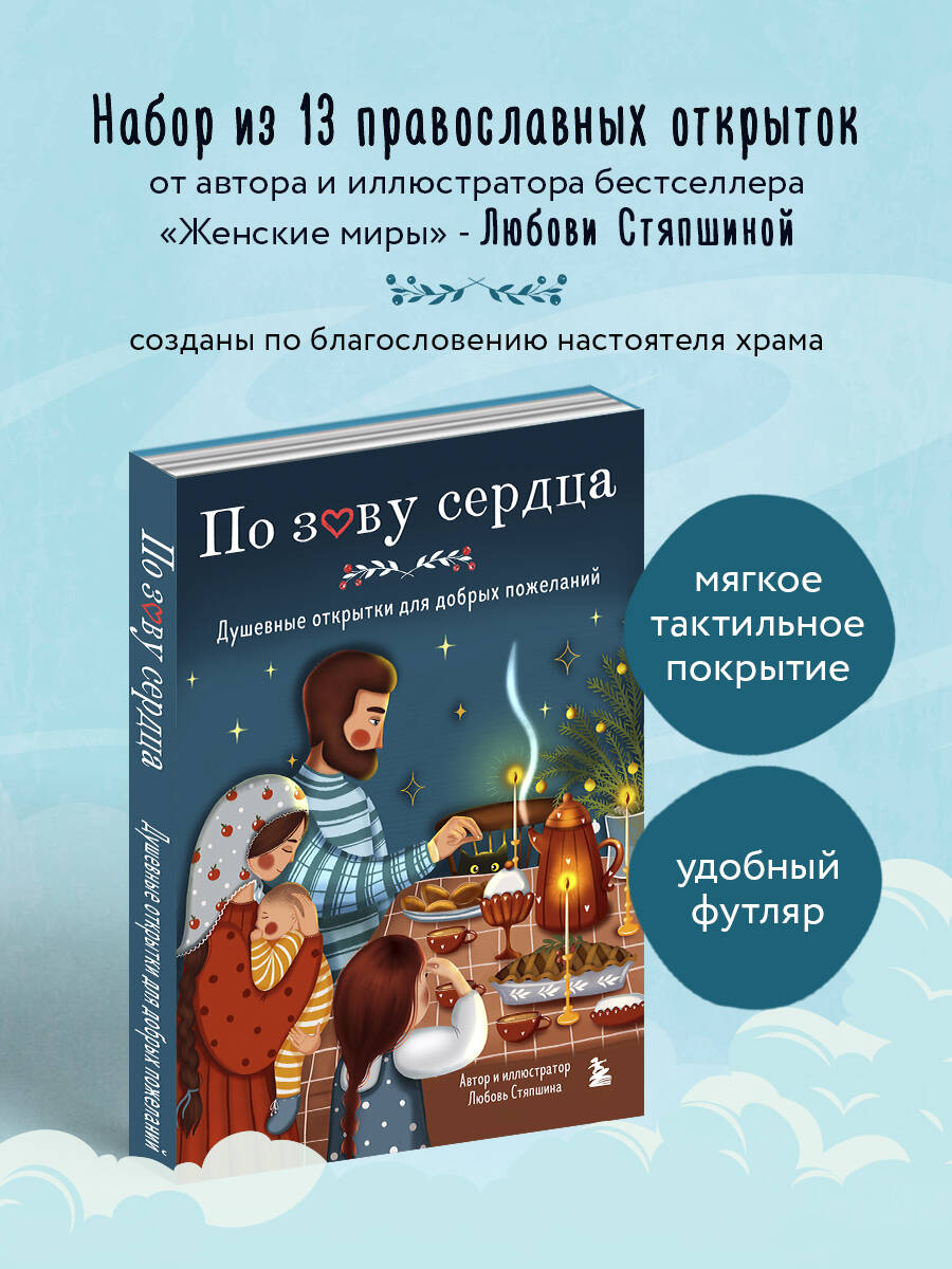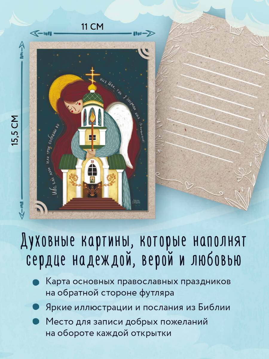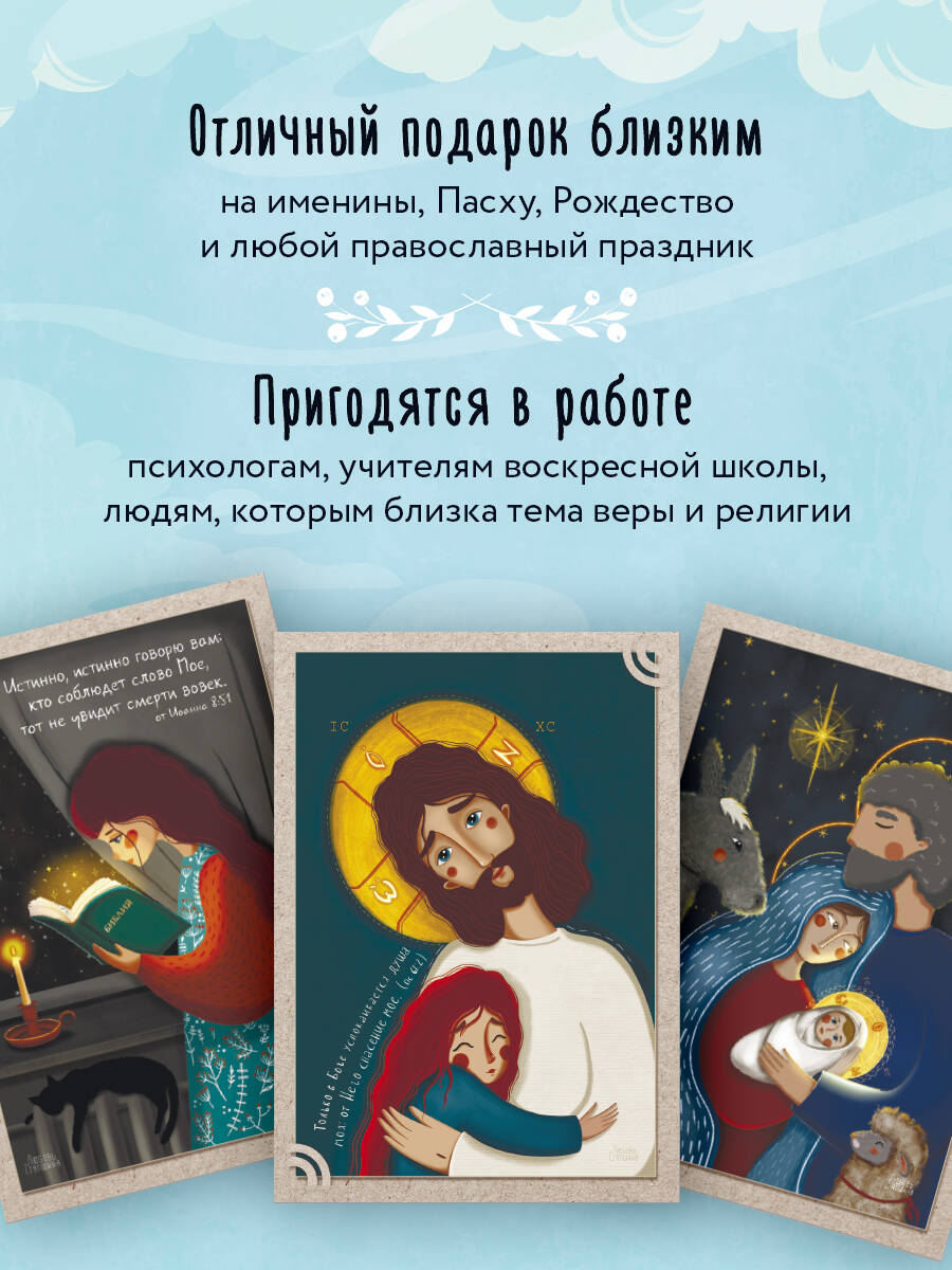 13 духовных картин, отпечатанных на тактильном вельветовом картоне, наполнят сердце надеждой, верой и любовью. На обратной стороне футляра - карта основных православных праздников. Открытки можно дарить своим родным и близким на именины, Пасху, Рождество и любой православный праздник. Разглядывая иллюстрации и читая послания из Библии, вы обретете поддержку, гармонию и умиротворение. Яркие, словно светящиеся изнутри образы художницы Любови Стяпшиной - это отличный повод для того, чтобы вспомнить семейные традиции и написать друг другу самые теплые слова. Набор могут использовать в своей работе психологи, учителя воскресной школы, люди, которым близка тема веры и религии. Духовные картины созданы по благословению настоятеля храма святого праведного Иоанна Кронштадтского поселка Ува иерея Сергия Полянцева.| Издательство | ООО "Издательство "Эксмо" |