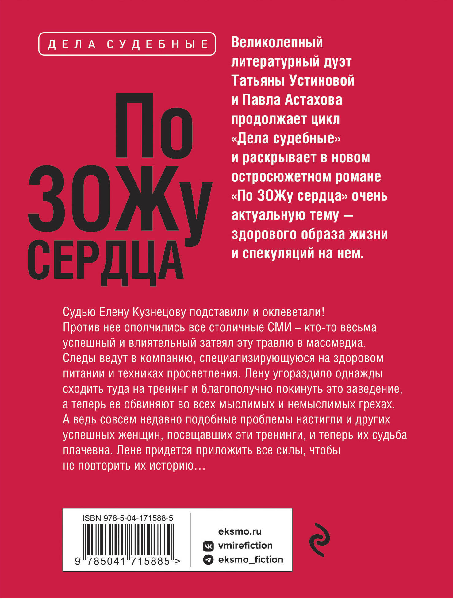 Судью Елену Кузнецову подставили и оклеветали! Против нее ополчились все столичные СМИ - кто-то весьма успешный и влиятельный затеял эту травлю в масс-медиа. Следы ведут в компанию, специализирующуюся на здоровом питании и техниках просветления. Лену угораздило однажды сходить туда на тренинг и благополучно покинуть это заведение, а теперь ее обвиняют во всех мыслимых и немыслимых грехах. А ведь совсем недавно подобные проблемы настигли и других успешных женщин, посещавших эти тренинги, и теперь их судьба плачевна… Остросюжетные романы из цикла «Дела судебные», написанные Татьяной Устиновой и Павлом Астаховым в соавторстве, отличаются особенной динамикой и собственным стилем: в них объединены опыт юриста Астахова и житейская философия Татьяны Устиновой, их чувство языка, любовь к достоверным деталям и вкус к хорошей истории. Это всегда гарантированное удовольствие от складного сюжета, лихой интриги, подлинных бытовых ситуаций, живых запоминающихся персонажей.| Издательство | ООО "Издательство "Эксмо" |