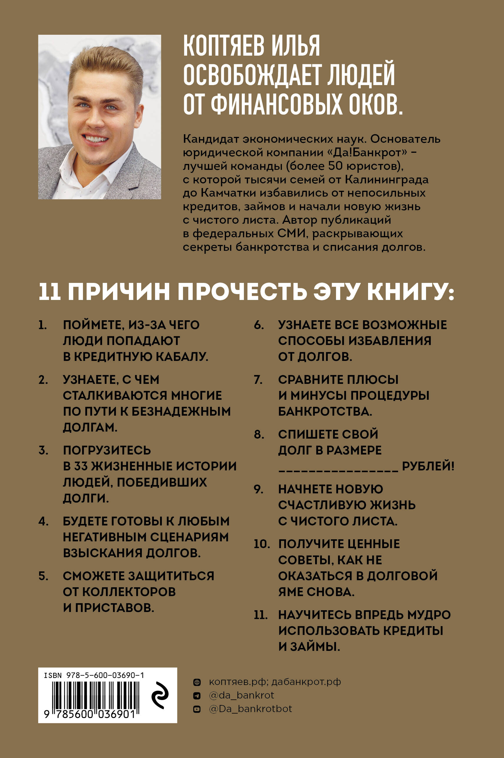 Если вы или ваши близкие оказались в тяжелой финансовой ситуации из-за кредитов и займов, то эта книга станет для вас настоящей находкой. Внутри вы найдете свыше 30 реальных историй людей, которые оказались в схожих ситуациях. Узнаете, почему это произошло, а также получите ценные рекомендации и практические советы о том, как начать новую счастливую жизнь без долгов с чистого листа. Книга окажется полезной не только тем, кто уже не в состоянии выплачивать свои кредиты и займы, но и тем, кто стоит перед выбором, платить по долгам или нет. Всем хорошо знакомо выражение «от сумы да от тюрьмы не зарекайся». Независимо от вашего текущего успеха, никто не застрахован от возможных финансовых трудностей и долгов. Мало кто мечтает оказаться в такой ситуации, но знание причин и понимание, как правильно поступить в таких случаях, имеют жизненно важное значение. Эта книга написана основателем ведущей юридической компании, которая помогла уже более 8000 семьям выйти из плена долгов и начать новую, счастливую жизнь. Будьте уверены, вы тоже сможете добиться финансовой свободы на все 100%.| Издательство | ООО "Издательство "Эксмо" |