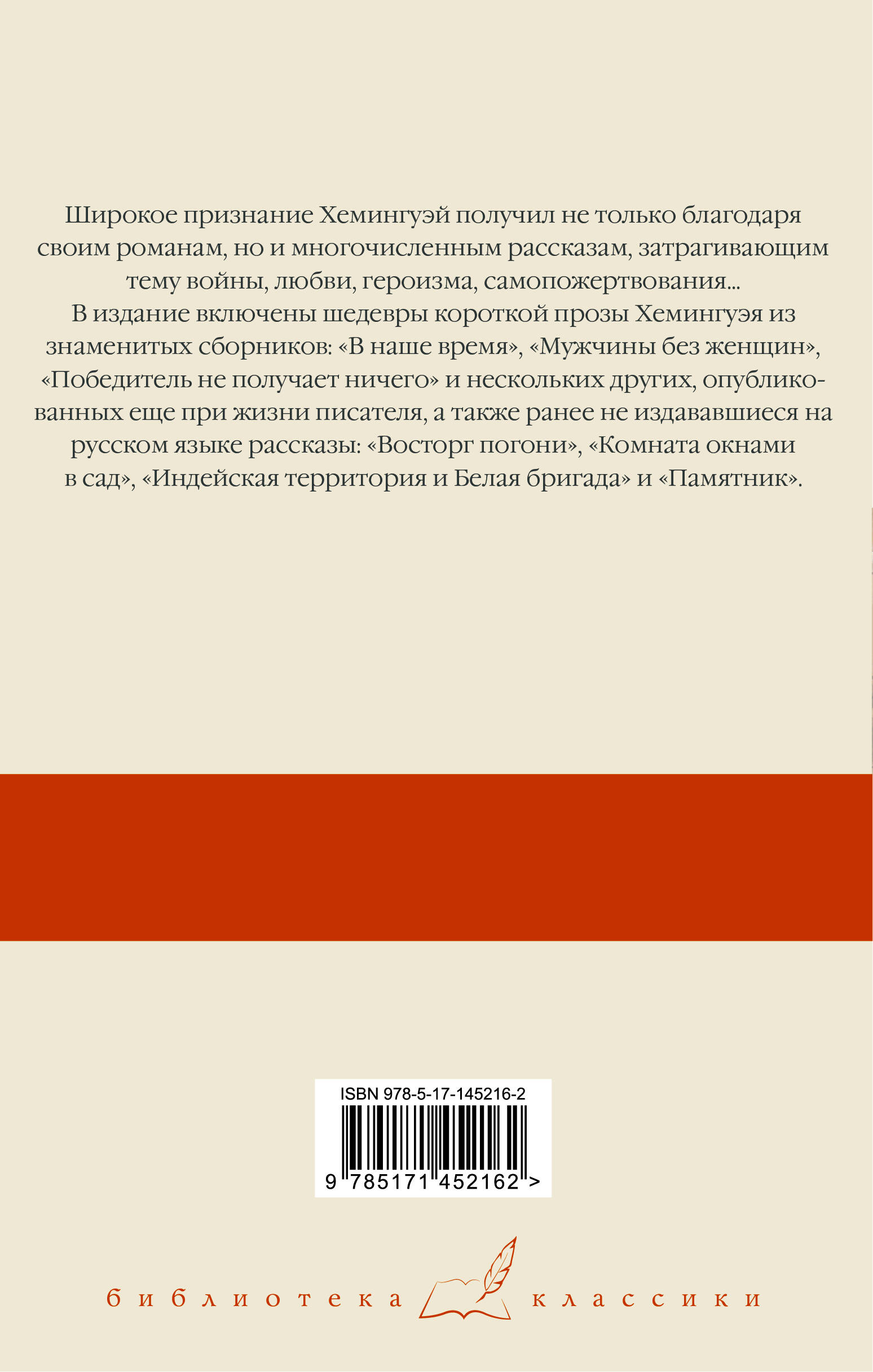 Широкое признание Хемингуэй получил не только благодаря своим романам, но и многочисленным рассказам, затрагивающим тему войны, любви, героизма, самопожертвования... В издание включены шедевры короткой прозы Хемингуэя из знаменитых сборников "В наше время", "Мужчины без женщин", "Победитель не получает ничего" и нескольких других, опубликованных еще при жизни писателя, а также ранее не издававшиеся на русском языке рассказы: "Восторг погони", "Индейская территория и Белая бригада", "Памятник" и "Комната окнами в сад".| Издательство | ИЗДАТЕЛЬСТВО "АСТ" |