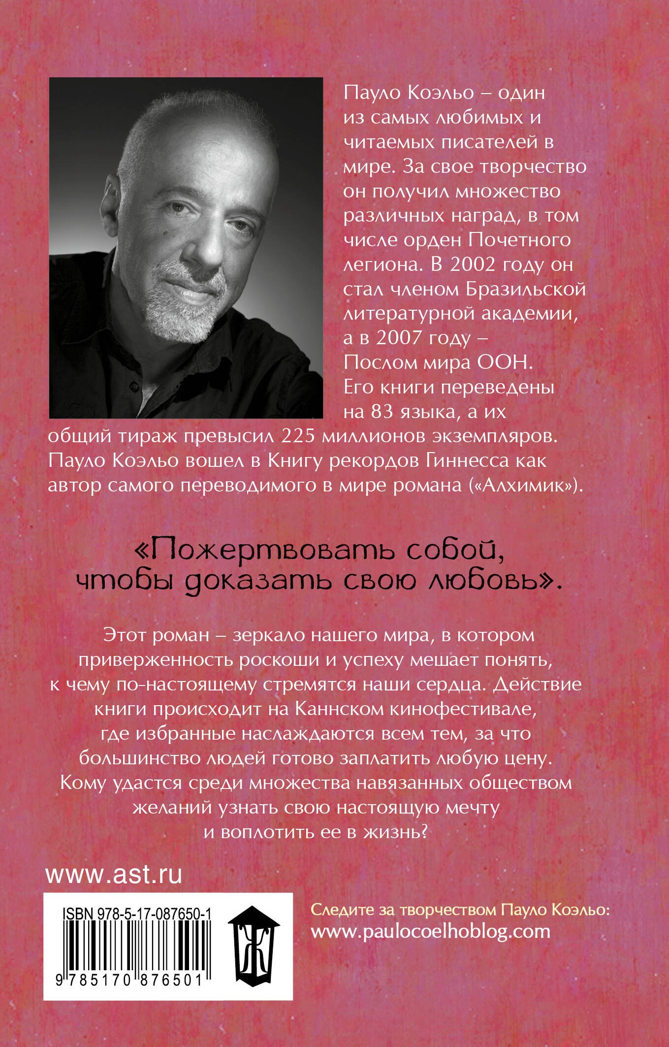 В романе "Победитель остается один" Пауло Коэльо возвращается к важным темам, поднятым в книгах "Одиннадцать минут" и "Заир". Этот роман - зеркало нашего мира, в котором приверженность роскоши и успеху мешает понять, к чему по-настоящему стремятся наши сердца. Действие книги происходит на Каннском кинофестивале, где избранные наслаждаются всем тем, за что большинство людей готово заплатить любую цену. Кому удастся среди множества навязанных обществом желаний узнать свою настоящую мечту и воплотить ее в жизнь?| Издательство | ИЗДАТЕЛЬСТВО "АСТ" |