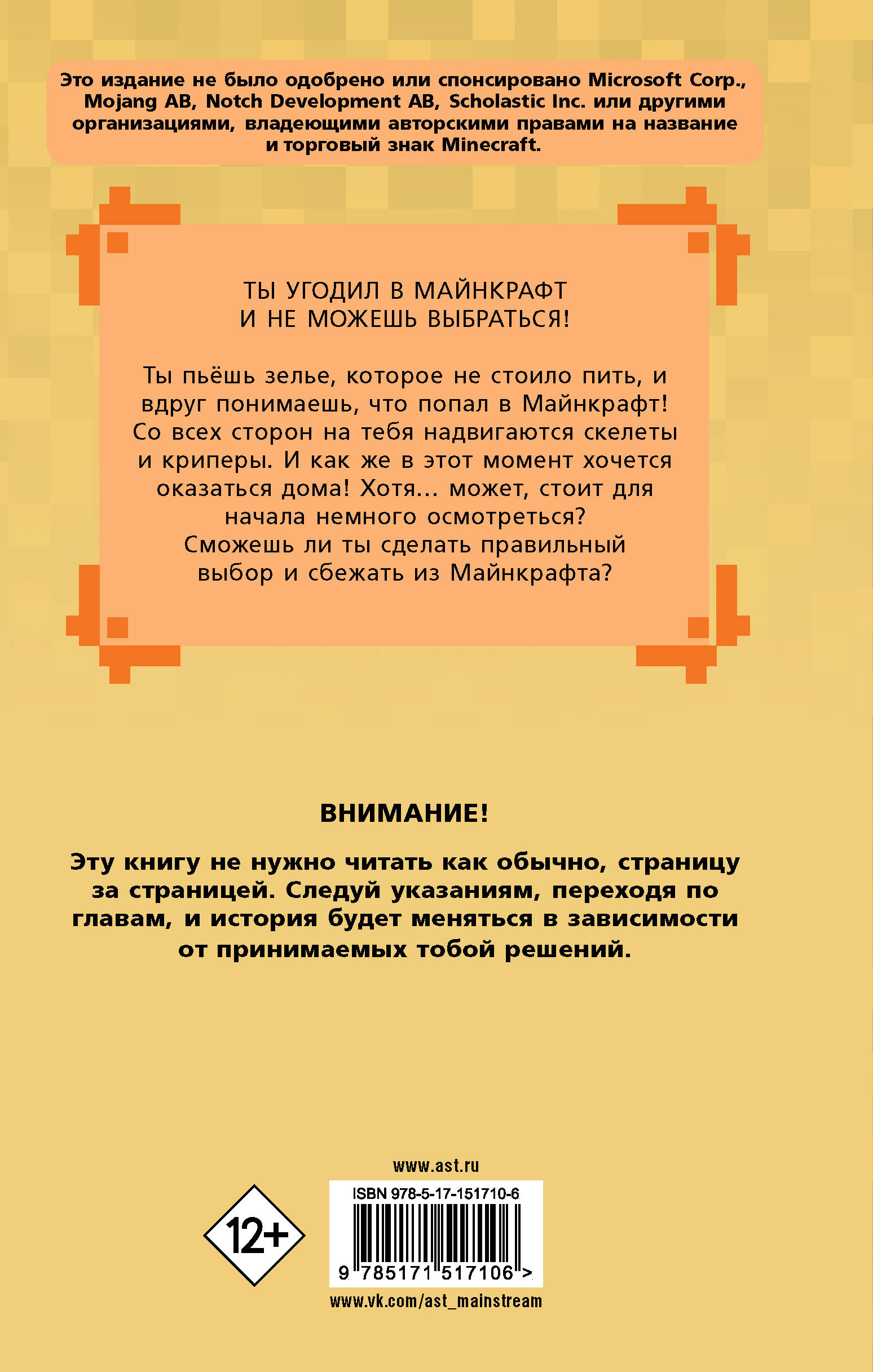 ТЫ УГОДИЛ В МАЙНКРАФТ И НЕ МОЖЕШЬ ВЫБРАТЬСЯ! Ты пьёшь зелье, которое не стоило пить, и вдруг понимаешь, что попал в Майнкрафт! Со всех сторон на тебя надвигаются скелеты и криперы. И как же в этот момент хочется оказаться дома! Хотя… может, стоит для начала немного осмотреться? Сможешь ли ты сделать правильный выбор и сбежать из Майнкрафта?| Издательство | ИЗДАТЕЛЬСТВО "АСТ" |