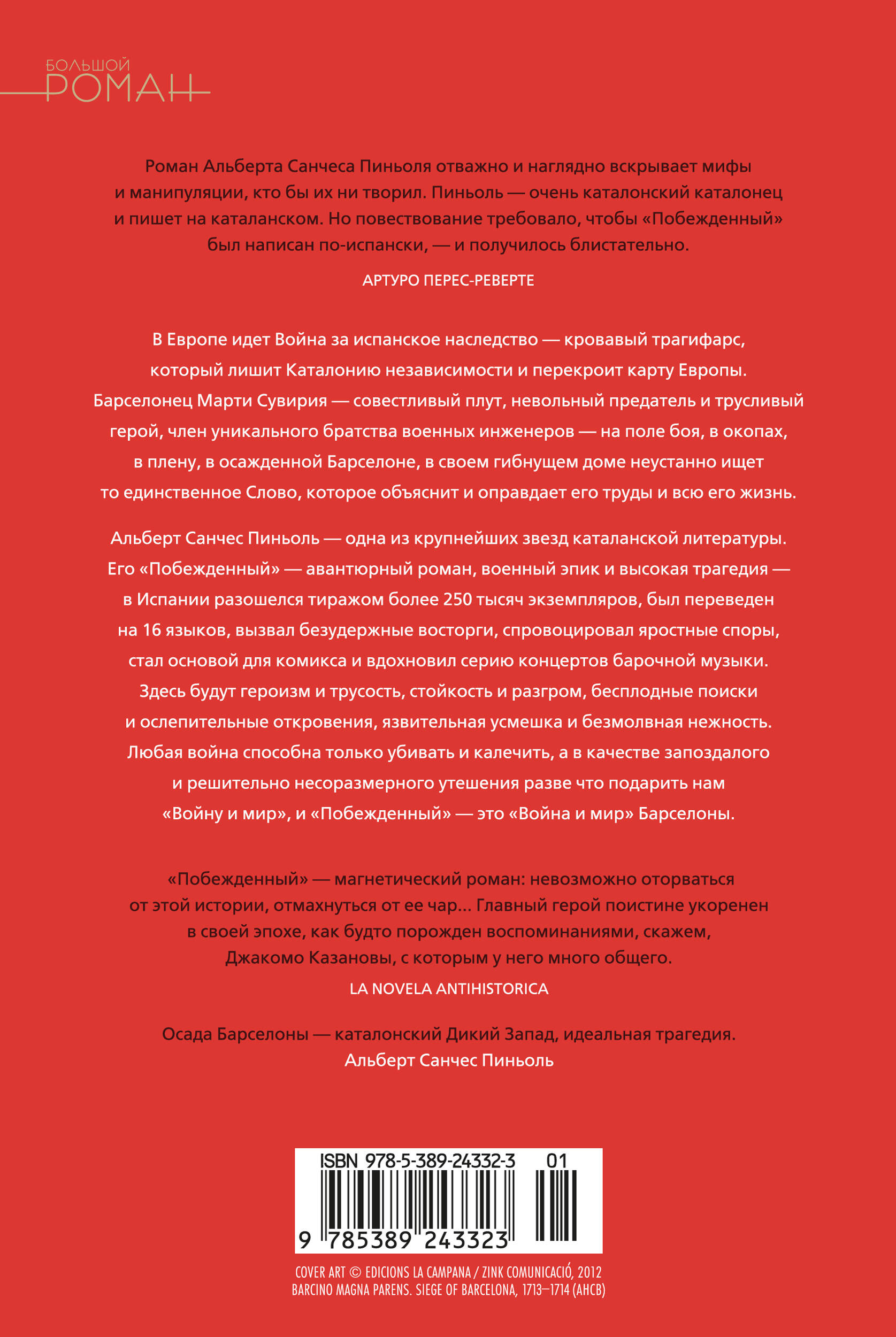 В Европе идет Война за испанское наследство - кровавый трагифарс, который лишит Каталонию всякой независимости и перекроит карту Европы на многие века вперед. Барселонец Марти Сувирия - совестливый плут, невольный предатель и трусливый герой, последний ученик великого французского теоретика фортификации Себастьена де Вобана, член уникального братства военных инженеров - на поле боя, в окопах, в плену, в осажденной Барселоне, в своем гибнущем доме неустанно ищет то единственное Слово, которое объяснит и оправдает его труды и всю его жизнь. Альберт Санчес Пиньоль - одна из крупнейших звезд каталанской литературы; оригинальностью и популярностью он не уступает Жауме Кабре. Его "Побежденный", авантюрный роман, военный эпик и высокая трагедия, отчасти отсылает нас к "Симплициссимусу" Гриммельсгаузена и "Похождениям бравого солдата Швейка" Ярослава Гашека, "Дуэли" Джозефа Конрада и "Запискам Флэшмена" Джорджа Макдоналда Фрейзера, которыми автор особенно вдохновлялся. В Испании роман разошелся тиражом более 250 тысяч экземпляров, был переведен на 16 языков, вызвал безудержные восторги, спровоцировал яростные споры, получил премию газеты El Periódico за лучший роман 2012 года, стал основой для комикса и вдобавок вдохновил серию концертов барочной музыки (а такое с современными романами случается редко). В "Побежденном" будут героизм и трусость, стойкость и разгром, бесплодные поиски и ослепительные откровения, язвительная усмешка и безмолвная нежность. Любая война способна только убивать и калечить, а в качестве запоздалого и решительно несоразмерного утешения разве что подарить нам "Войну и мир", и "Побежденный" - это "Война и мир" Барселоны. Впервые на русском!| Издательство | Азбука-Аттикус Издат.группа ООО |