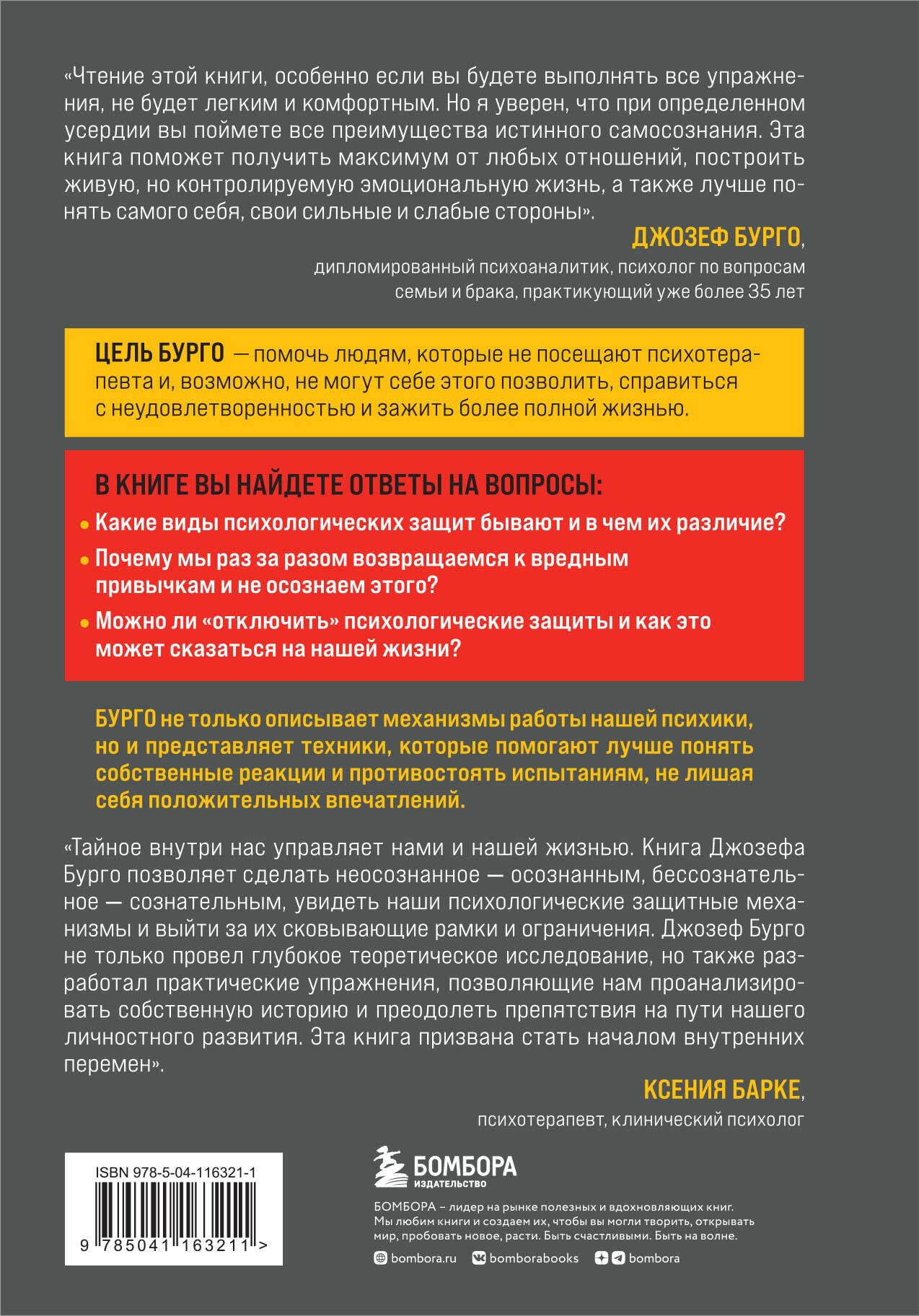 «Чтение этой книги, особенно если вы будете выполнять все упражнения, не будет легким и комфортным. Но я уверен, что при определенном усердии вы поймете все преимущества истинного самосознания. Эта книга поможет получить максимум от любых отношений, построить живую, но контролируемую эмоциональную жизнь, а также лучше понять самого себя, свои сильные и слабые стороны». - Джозеф Бурго, психоаналитик, психолог по вопросам семьи и брака, практикующий уже более 35 лет Цель Бурго - помочь людям, которые не посещают психотерапевта и, возможно, не могут себе этого позволить, справиться с неудовлетворенностью и зажить более полной жизнью. В «Почему я делаю?» вы найдете ответы на вопросы: • Какие механизмы позволяют нам справиться с негативными последствиями болезненного опыта? • Каким образом эти же механизмы лишают нас удовольствия и мешают развиваться? • Возможно ли «отключить» эту систему самозащиты и научиться управлять своими эмоциями более осознанно? Бурго не только описывает механизмы работы нашей психики, но и представляет техники, которые помогают лучше понять собственные реакции и противостоять испытаниям, не лишая себя положительных впечатлений.| Издательство | Эксмо |