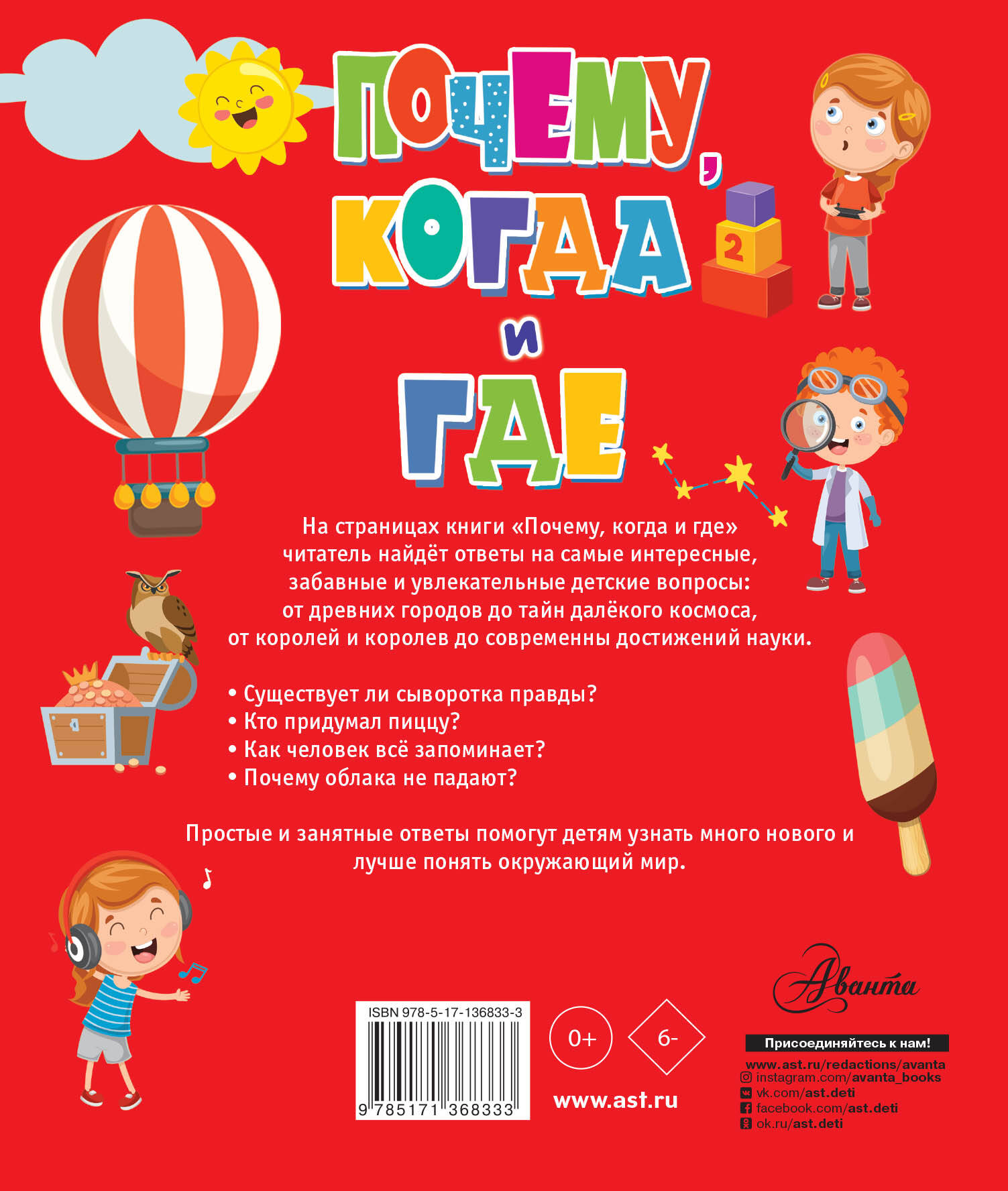 На страницах книги «Почему, когда и где» читатель найдёт ответы на самые интересные, забавные и увлекательные детские вопросы: от древних городов до тайн далекого космоса, от королей и королев до современных достижений науки. . Существует ли сыворотка правды? . Кто придумал пиццу? . Как человек всё запоминает? . Почему облака не падают? Простые и занятные ответы помогут детям узнать много нового и лучше понять окружающий мир.