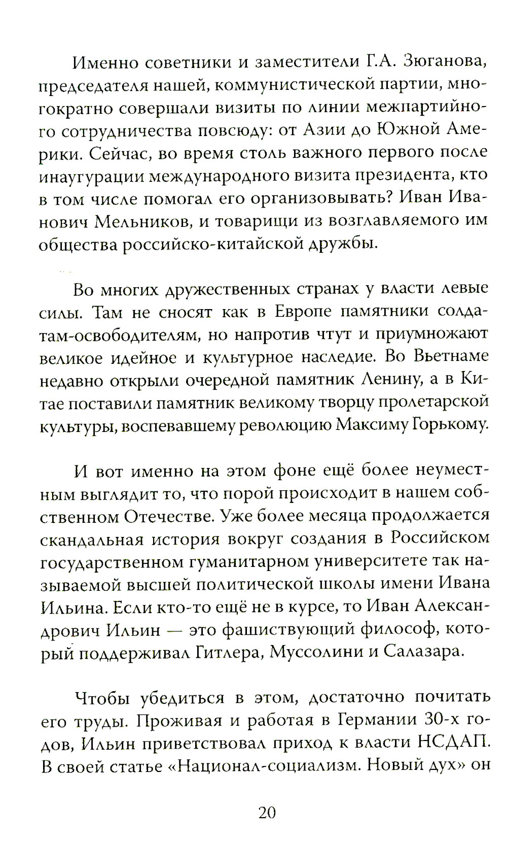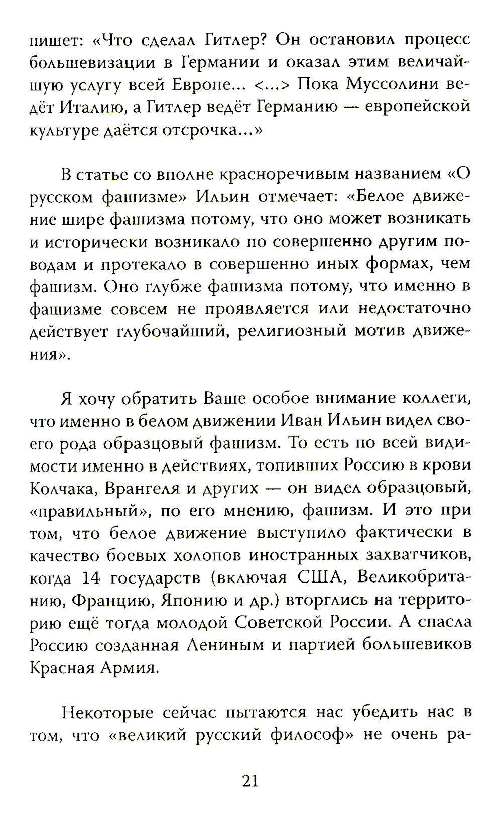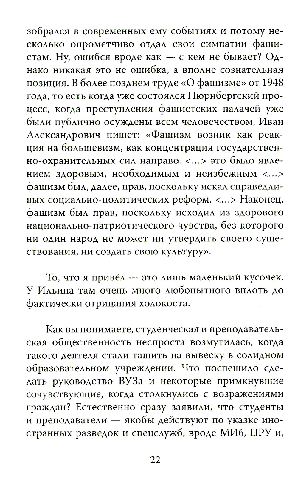 Философ и публицист Иван Ильин (1883-1954), скончавшийся в эмиграции ровно 70 лет назад, в последние годы неожиданно стал одной из самых спорных фигур в российской политике. Его часто цитируют. Постоянно переиздают. В нем видят идеолога «новой России», которая должна оказаться успешной и сильной. При этом Россия в наше время стала мировым лидером в борьбе с неонацизмом, а Ильин увлекался крайне правыми идеями, был сторонником итальянских фашистов и немецких нацистов, благодушно рассуждал о «русском фашизме». Оказавшись в Европе - а он большую часть жизни провел в Германии и Швейцарии - Ильин превратился в непримиримого борца с большевиками, а по сути - с Советской Россией. Мечтая о «белом реванше», он шел на сотрудничество со всеми противниками Москвы, не брезгуя зарубежными разведками. При этом, профессор был крайне осторожным человеком и в экстремальных ситуациях предпочитал оставаться в стороне... В этой книге о наследии Ильина рассуждают представители разных идейных направлений. Православные, коммунисты, либералы, патриоты... Так кем же был Иван Ильин - светочем русской мысли или неудачливым нацистом? От ответа на этот вопрос во многом зависит наше будущее.| Издательство | Родина |