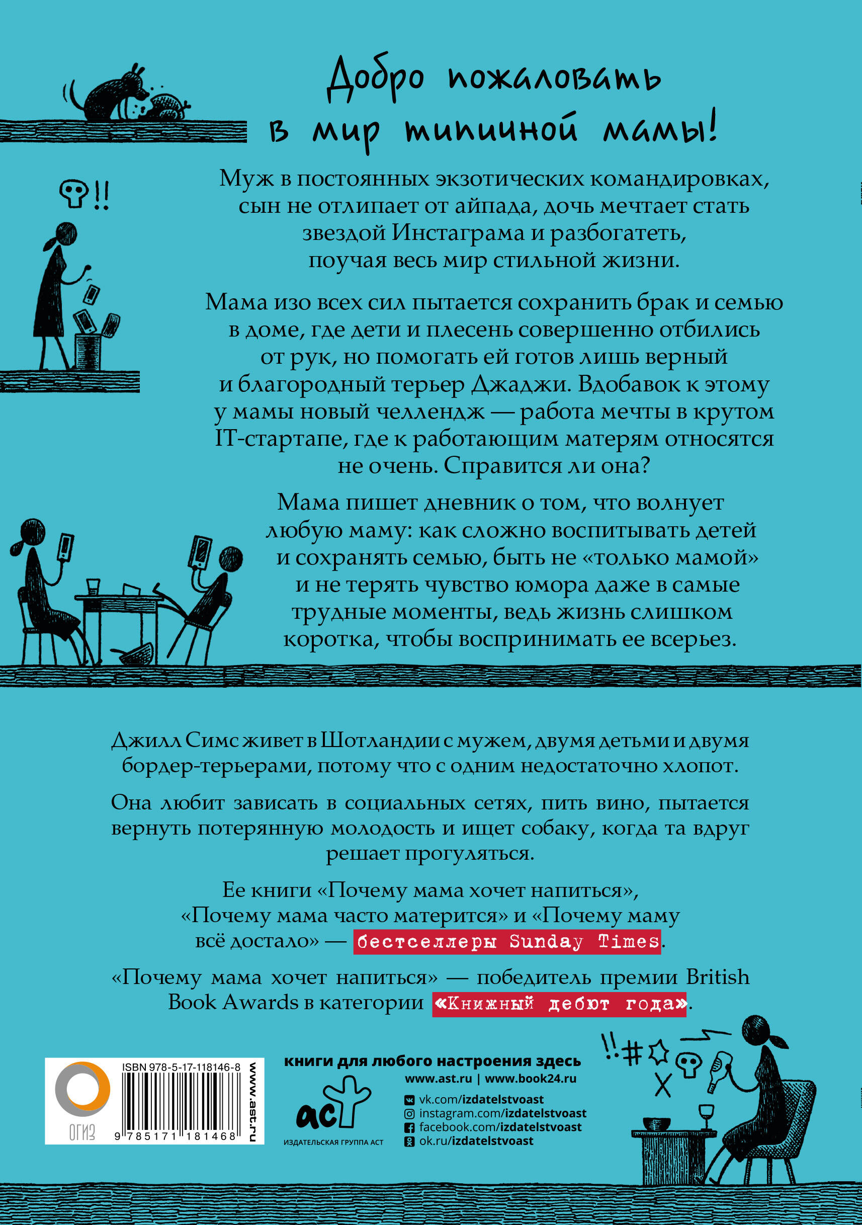Добро пожаловать в мир типичной мамы! Муж в постоянных экзотических командировках, сын не отлипает от айпада, дочь мечтает стать звездой Инстаграма и разбогатеть, поучая весь мир стильной жизни. Мама изо всех сил пытается сохранить брак и семью в доме, где дети и плесень совершенно отбились от рук, но помогать ей готов лишь верный и благородный терьер Джаджи. Вдобавок к этому у мамы новый челлендж - работа мечты в крутом IT-стартапе, где к работающим матерям относятся не очень. Справится ли она? Мама пишет дневник о том, что волнует любую маму: как сложно воспитывать детей и сохранять семью, не быть "только мамой" и не терять чувство юмора даже в самые трудные моменты, ведь жизнь слишком коротка, чтобы воспринимать ее всерьез. Джилл Симс живет в Шотландии с мужем, двумя детьми и двумя бордер-терьерами, потому что с одним недостаточно хлопот. Она любит зависать в социальных сетях, пить вино, пытается вернуть потерянную молодость и ищет собаку, когда та вдруг решает прогуляться. Ее книги "Почему мама хочет напиться", "Почему мама часто матерится" и "Почему маму всё достало" - бестселлеры Sunday Times. "Почему мама хочет напиться" - победитель премии British Book Awards в категории "Книжный дебют года".