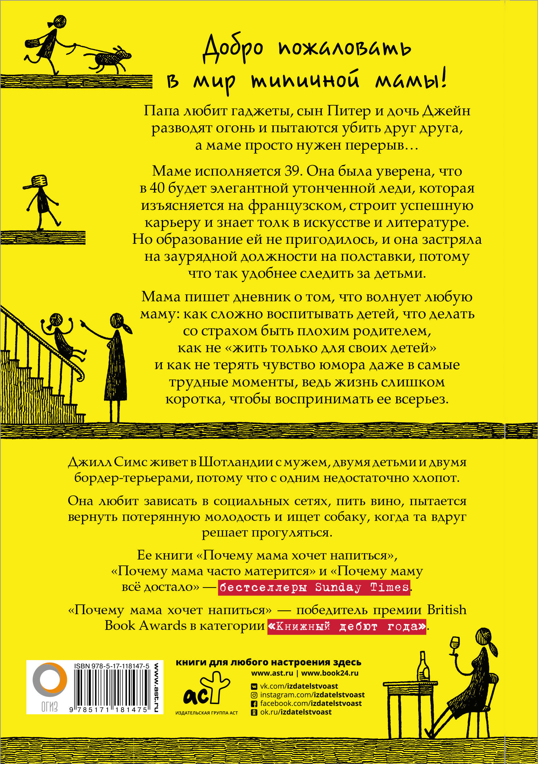 Добро пожаловать в мир типичной мамы! Папа любит гаджеты, сын Питер и дочь Джейн разводят огонь и пытаются убить друг друга, а маме просто нужен перерыв... Маме исполняется 39. Она была уверена, что в 40 будет элегантной утонченной леди, которая изъясняется на французском, строит успешную карьеру и знает толк в искусстве и литературе. Но образование ей не пригодилось, и она застряла на заурядной должности на полставки, потому что так удобнее следить за детьми. Мама пишет дневник о том, что волнует любую маму: как сложно воспитывать детей, что делать со страхом быть плохим родителем, как не "жить только для своих детей" и как не терять чувство юмора даже в самые трудные моменты, ведь жизнь слишком коротка, чтобы воспринимать её всерьёз. Джилл Симс живет в Шотландии с мужем, двумя детьми и двумя бордер-терьерами, потому что с одним недостаточно хлопот. Она любит зависать в социальных сетях, пить вино, пытается вернуть потерянную молодость и ищет собаку, когда та вдруг решает прогуляться. Её книги "Почему мама хочет напиться", "Почему мама часто матерится" и "Почему маму всё достало" - бестселлеры Sunday Times. "Почему мама хочет напиться" - победитель премии British Book Awards в категории "Книжный дебют года".| Издательство | ИЗДАТЕЛЬСТВО "АСТ" |