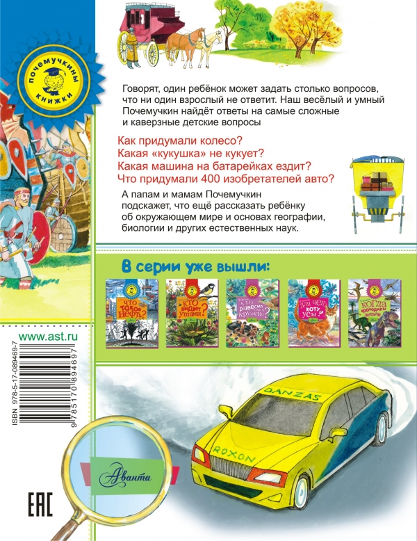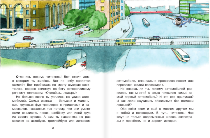 Чего больше всего на улицах крупных городов? Конечно же, самых разных автомобилей - больших и маленьких, грузовых фур-трейлеров с прицепами и самосвалов. Вы и ваш малыш наверняка не раз катались на автобусе, троллейбусе или легковом автомобиле. Но знаете ли вы, почему автомобилей развелось так много? А когда появился самый-самый первый автомобиль? И кто его придумал? И как люди научили свои повозки обходиться без помощи лошадей, ездить самостоятельно? Обо всём этом и ещё о многом другом мы расскажем в этой книжке. В путь, читатель! Нас ждут не только современные шоссе, автострады и просёлки, но и дороги истории.