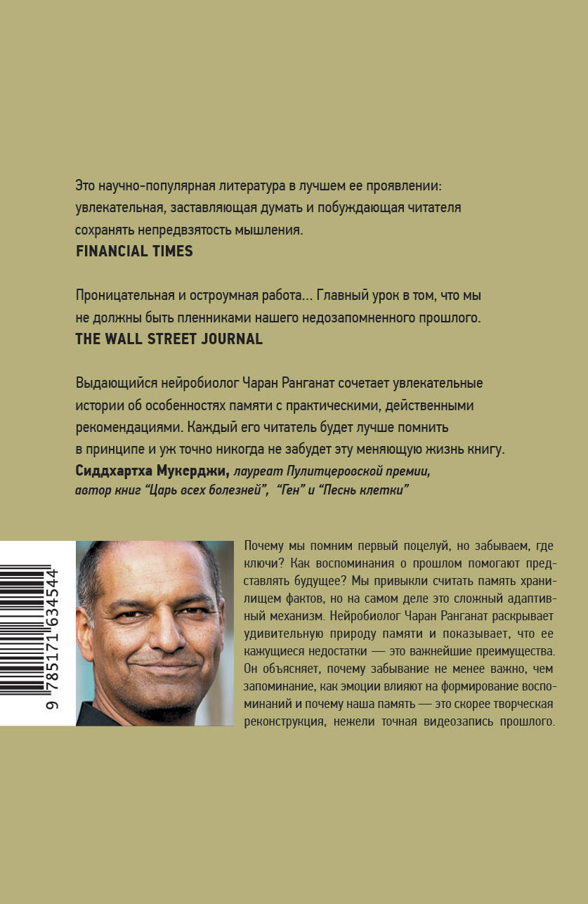 Нейробиолог Чаран Ранганат исследует фундаментальные механизмы человеческой памяти, опираясь на последние открытия в области нейронауки, когнитивной психологии и эволюционной биологии. Он рассматривает ключевые аспекты работы памяти: консолидацию воспоминаний, селективное забывание, роль сна в обработке информации, влияние эмоций на запоминание и нейронные основы автобиографической памяти. Особое внимание автор уделяет практическим аспектам: формированию долговременной памяти, связи памяти с принятием решений, влиянию цифровых технологий на когнитивные способности и методам улучшения памяти в повседневной жизни.| Издательство | Издательство "АСТ" |