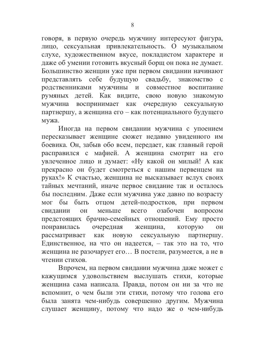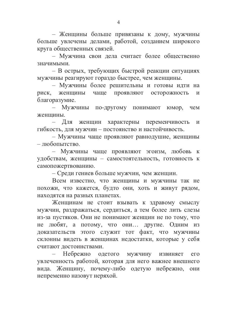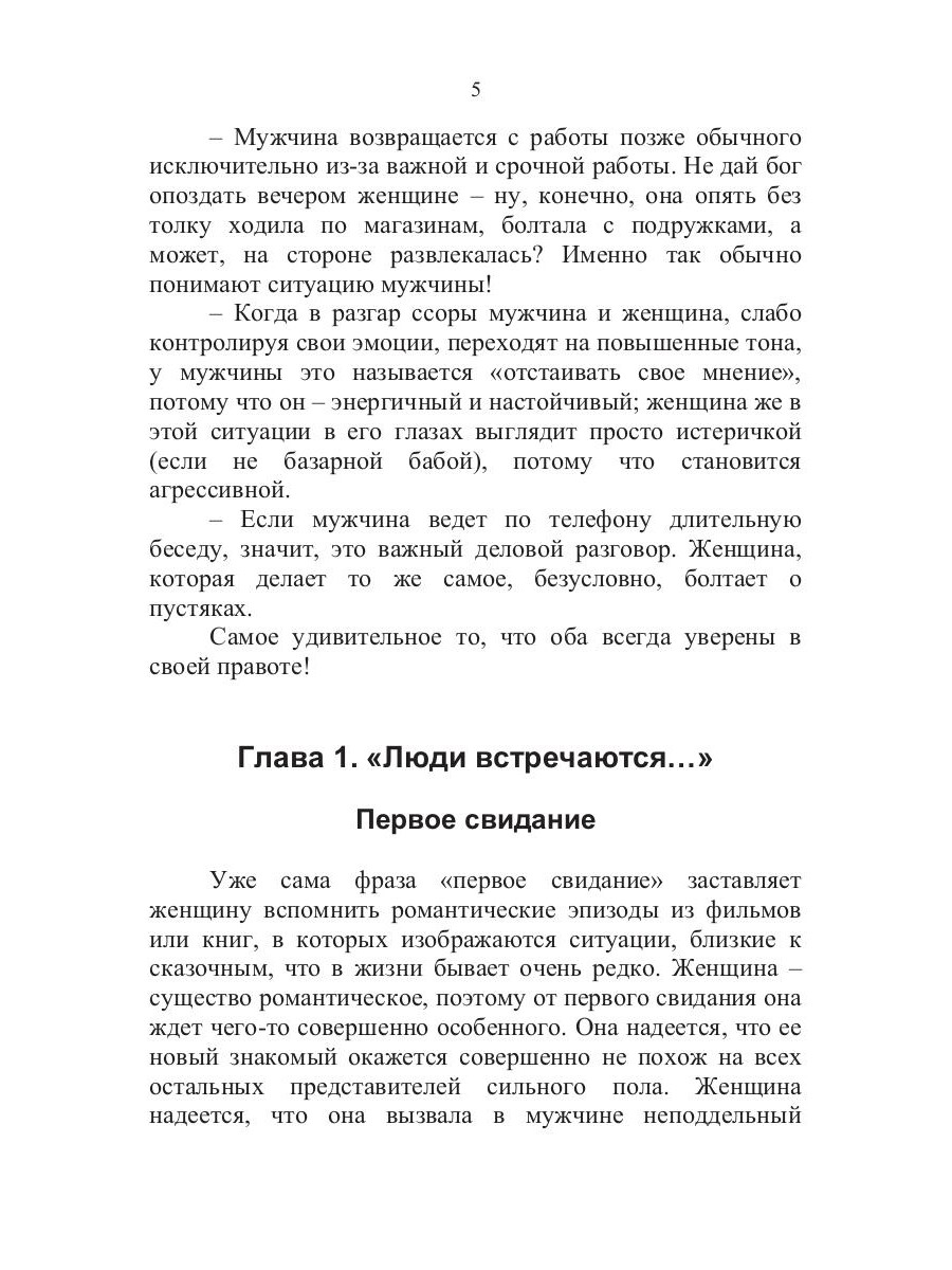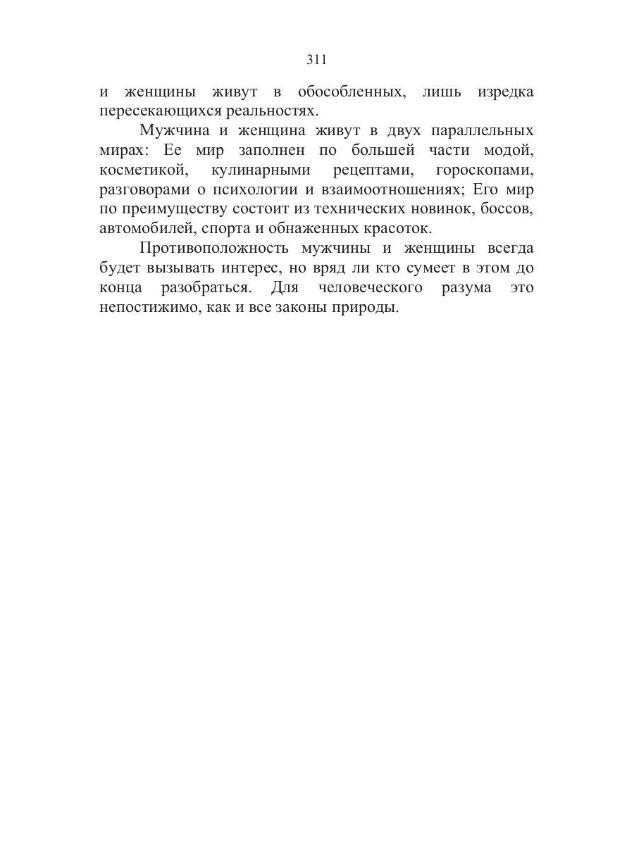 Почему мужчина и женщина так по-разному реагируют на одни и те же ситуации, в чем заключается причина их взаимного непонимания и конфликтов? Эти проблемы в определенный период жизни наверняка вставали перед каждым из нас. Однозначный ответ на подобные вопросы найти невозможно, да и не нужно его искать, главное - признать принципиальную оригинальность и непохожесть двух полов. Именно к такому решению и подводит эта книга, в легкой и доступной форме рассказывающая о двух различных взглядах на мир.