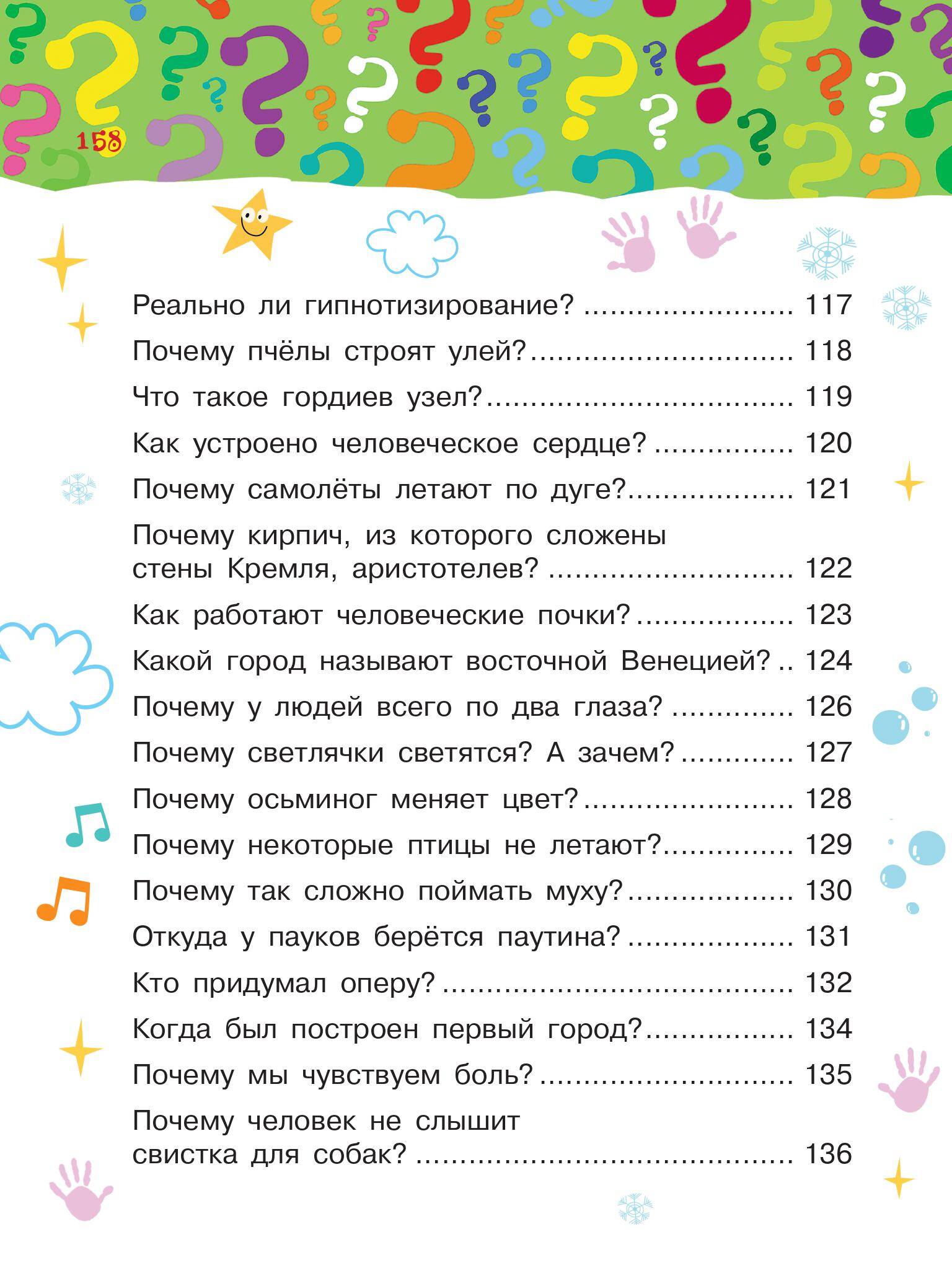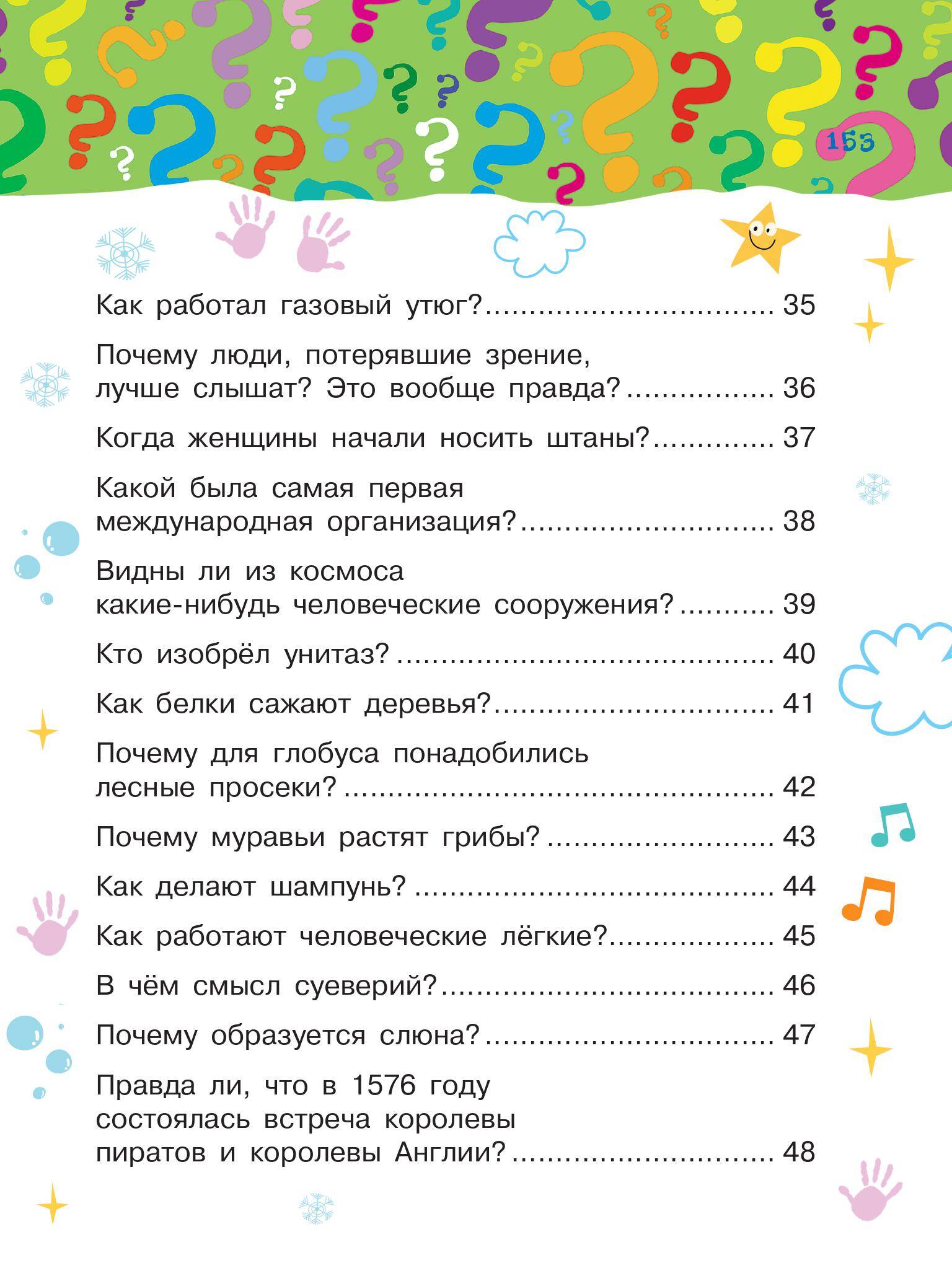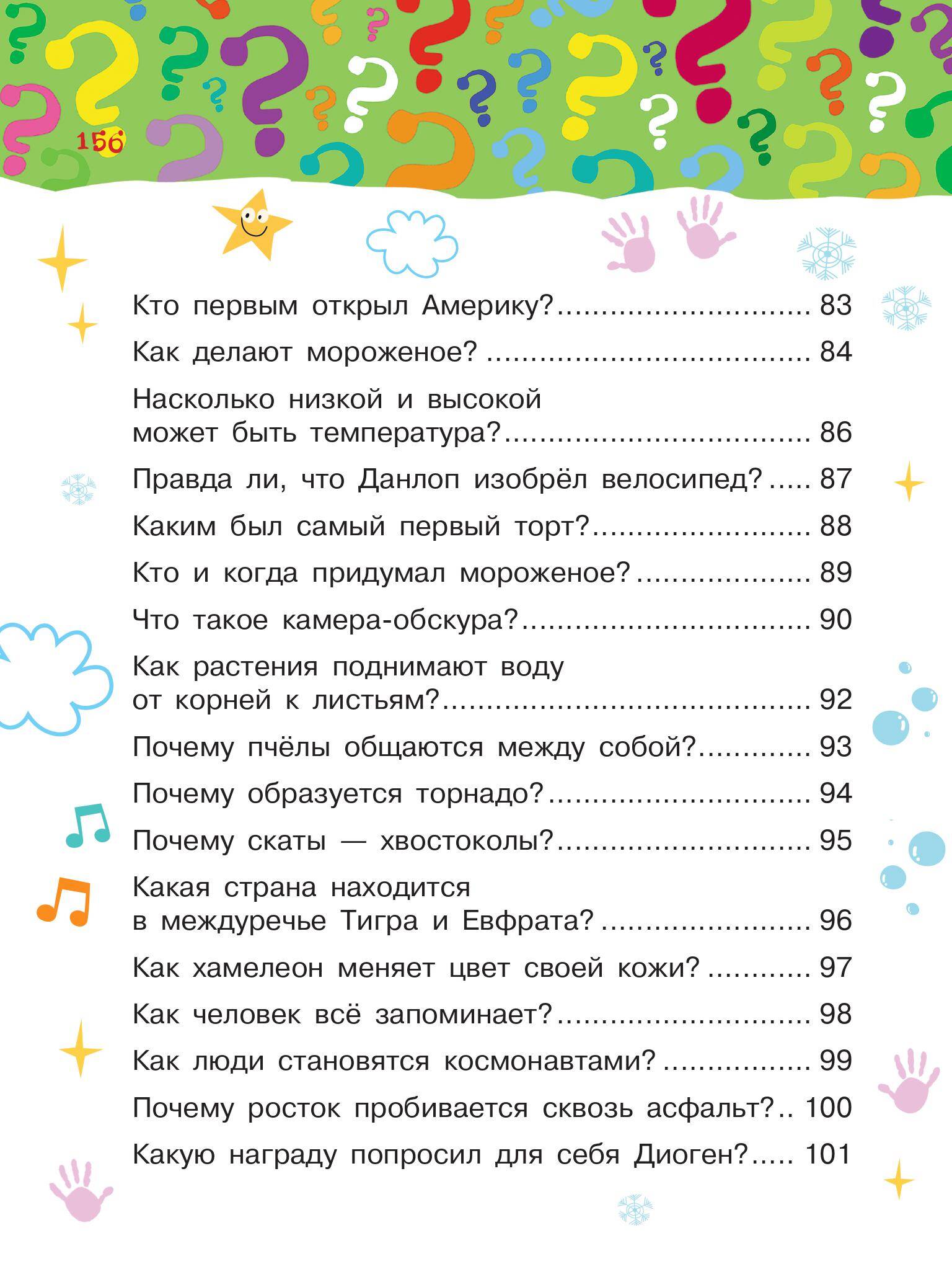Открыв эту книгу, вы получите ответы на все ваши вопросы об окружающем мире. Почему вода в океанах такая солёная? Каким был первый торт? Почему у людей всего два глаза? Книга сделана в формате один вопрос и ответ на страницу, благодаря чему информация усваивается легко и просто. Вы узнаете много нового о физике, биологии, химии, истории, астрономии и даже сможете рассказать своим друзьям, кто и когда придумал первое мороженое. Для среднего школьного возраста.