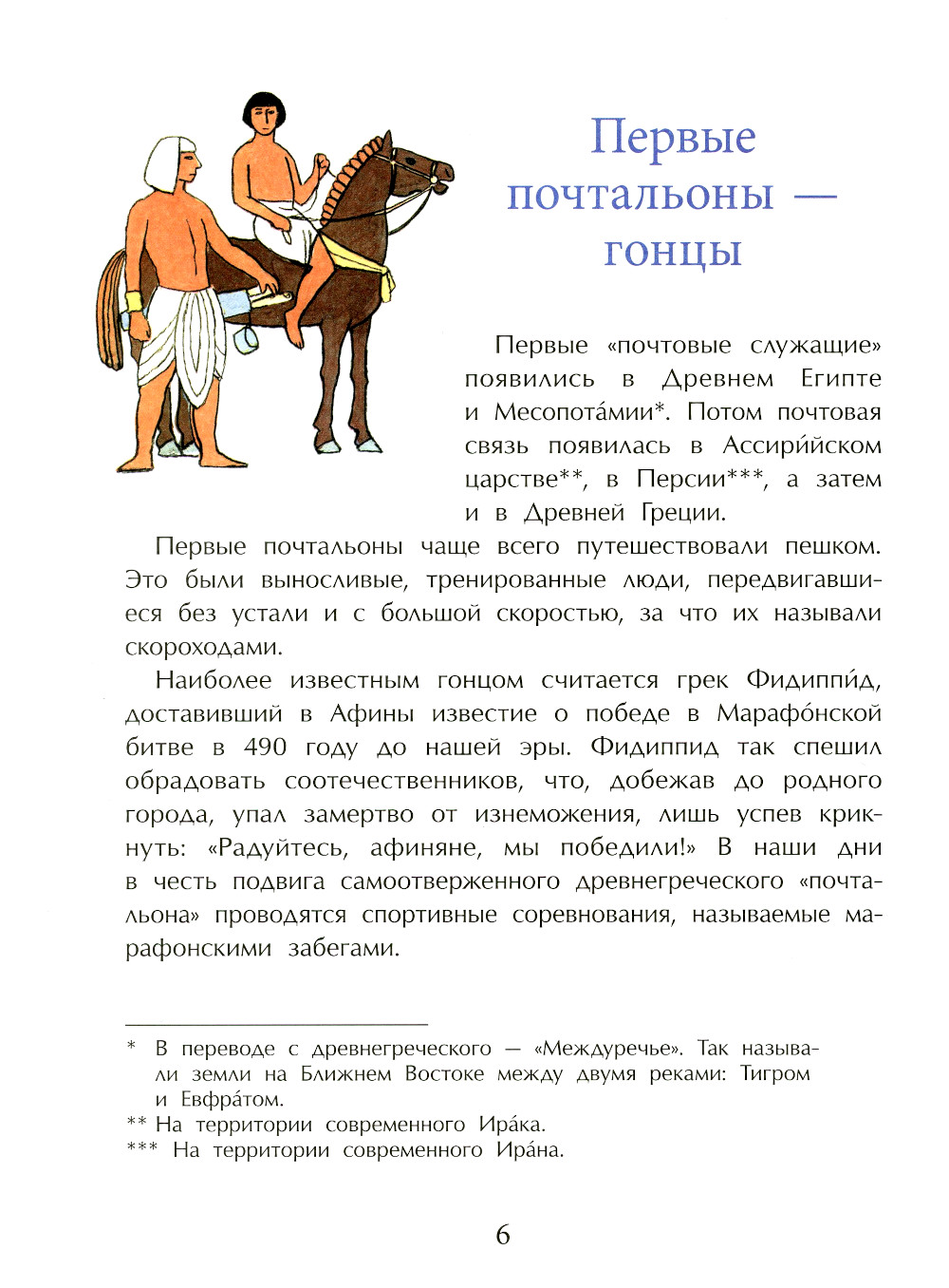 Познавательная книга Михаила Пегова уводит читателя в глубину веков. Историю почты автор начинает с наскальных изображений и первых почтальонов-гонцов в Египте, Персии, Древней Греции. Рассказывает, какой была почтовая связь в Древнем Риме, в Средневековой Европе, в России, знакомит с удивительной историей первого почтового ящика и с тем, какую роль в развитии почты сыграл мореплаватель Магеллан. Отдельная глава посвящена фронтовым треугольникам времен Великой Отечественной войны. Заключает книгу разговор о современном виде почты - электронном почтовом ящике.