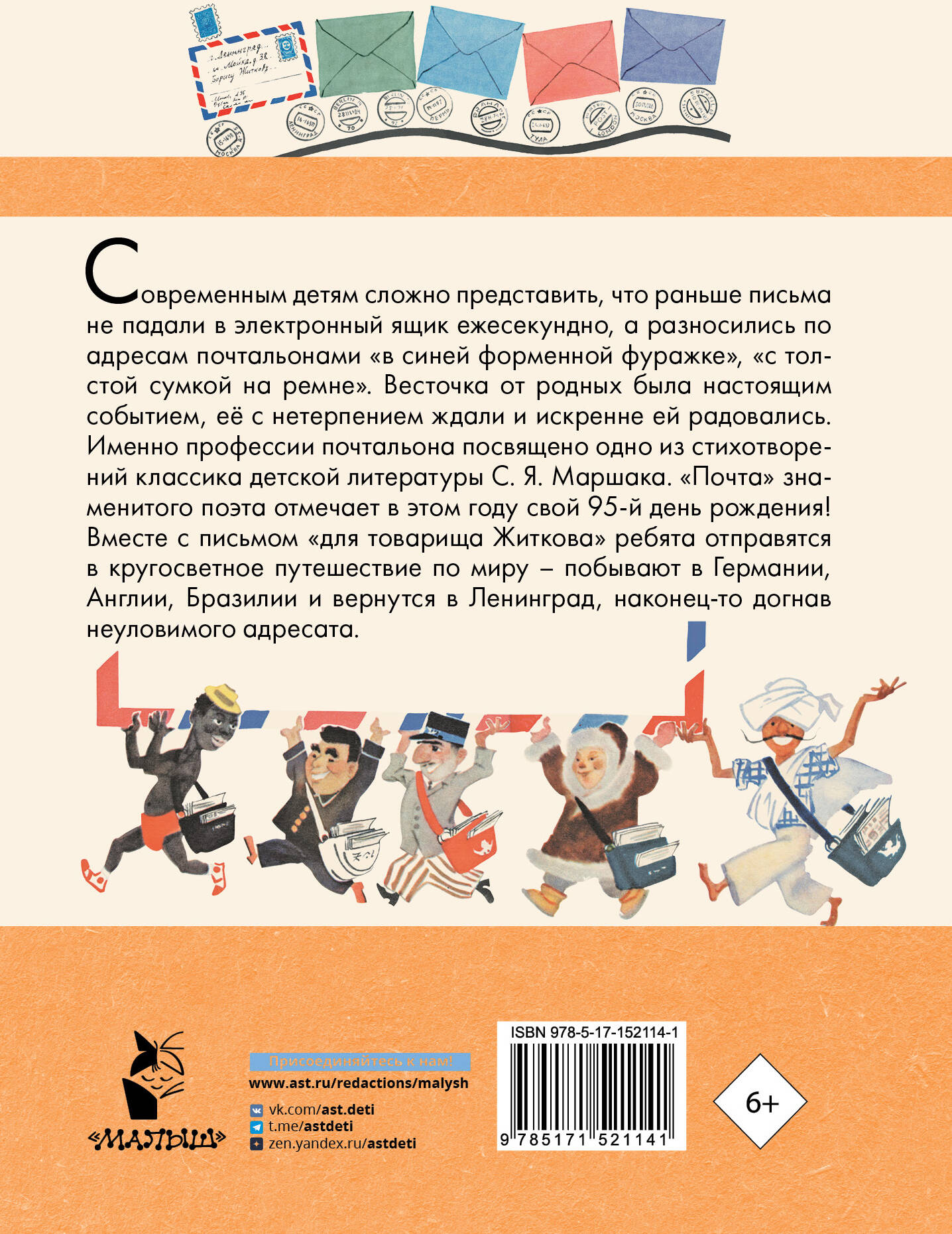 Современным детям сложно представить, что раньше письма не падали в электронный ящик, а разносились по адресам почтальонами «в синей форменной фуражке», «с толстой сумкой на ремне». Весточка от родных была настоящим событием, её с нетерпением ждали и искренне ей радовались. Именно профессии почтальона посвящено одно из стихотворений классика детской литературы С. Я. Маршака. «Почта» знаменитого поэта отмечает в этом году свой 95-й день рождения! Вместе с письмом «для товарища Житкова» ребята отправятся в кругосветное путешествие по миру - побывают в Германии, Англии, Бразилии и вернутся в Ленинград, наконец-то догнав неуловимого адресата.| Издательство | ИЗДАТЕЛЬСТВО "АСТ" |