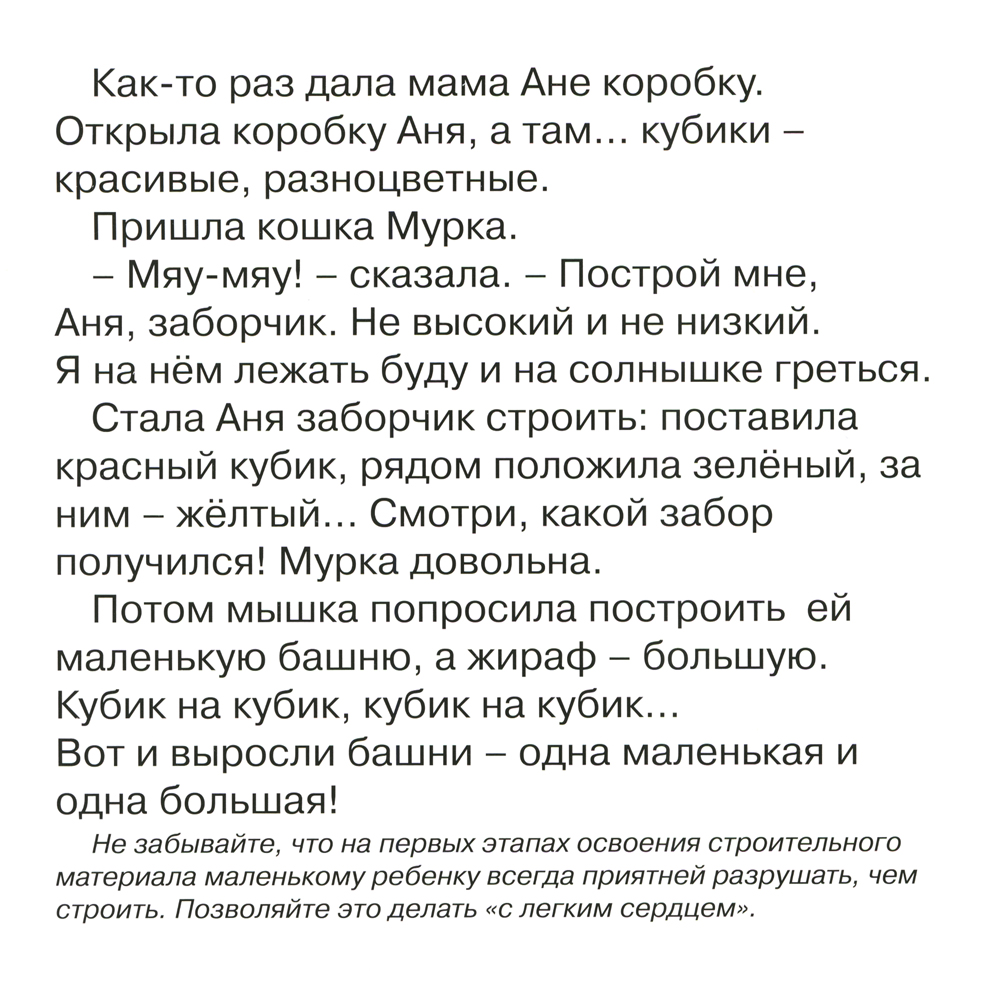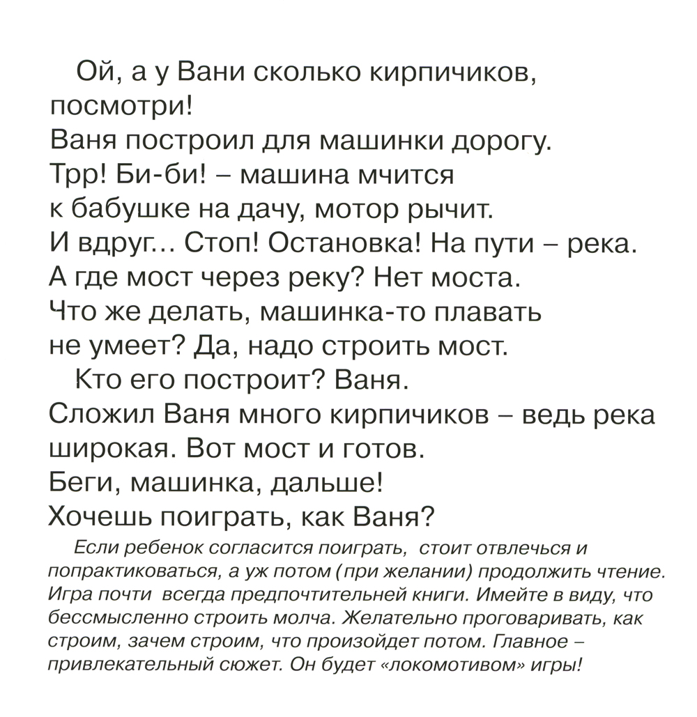 Комплект "Почти говорим №2 " содержит книги: "Мы любим кубики" Почитали - поиграли! Пусть кубики будут рядом! Это такая книжка: читаем и играем одновременно! Дети изначально не знают, как именно играть. Мы попробуем ненавязчиво им это продемонстрировать в книжке на примерах игры Вани и Ани. Последовательность в освоении строительного материала такова: знакомим с назначением каждой детали (кубик, кирпичик, «крыша» и т.д.), потом предлагаем сюжеты для игры - «дорога», «дача, деревня», «чаепитие кукол»... Сначала играют Ваня и Аня, а потом и вы со своим ребёнком! "Много-мало","Один-много", "Что такое?" В чем развивающий эффект. Может ли он быть в подобных незатейливых текстах? Несомненно! Именно такими они и должны быть - простыми, короткими, понятными. Эффект усилится, если вы будете не читать, а эмоционально проговаривать «от себя», по возможности включая мимику и жесты и при этом находясь в плотном тактильном контакте - тут погладили, там чмокнули, здесь покачали на коленях и т.д. Особенно важно понимать, что дети разные, а текст один. Прислушивайтесь к ребенку, вовремя «вворачивайте» свои слова и комментарии, помогающие малышу быть сосредоточенным на просматриваемом эпизоде. Возвращайтесь к ранее прочитанному. Детям это крайне необходимо!| Издательство | Творческий центр Сфера |