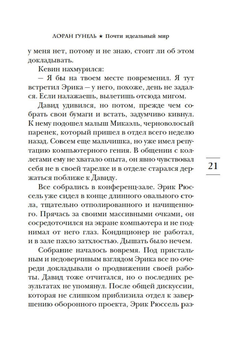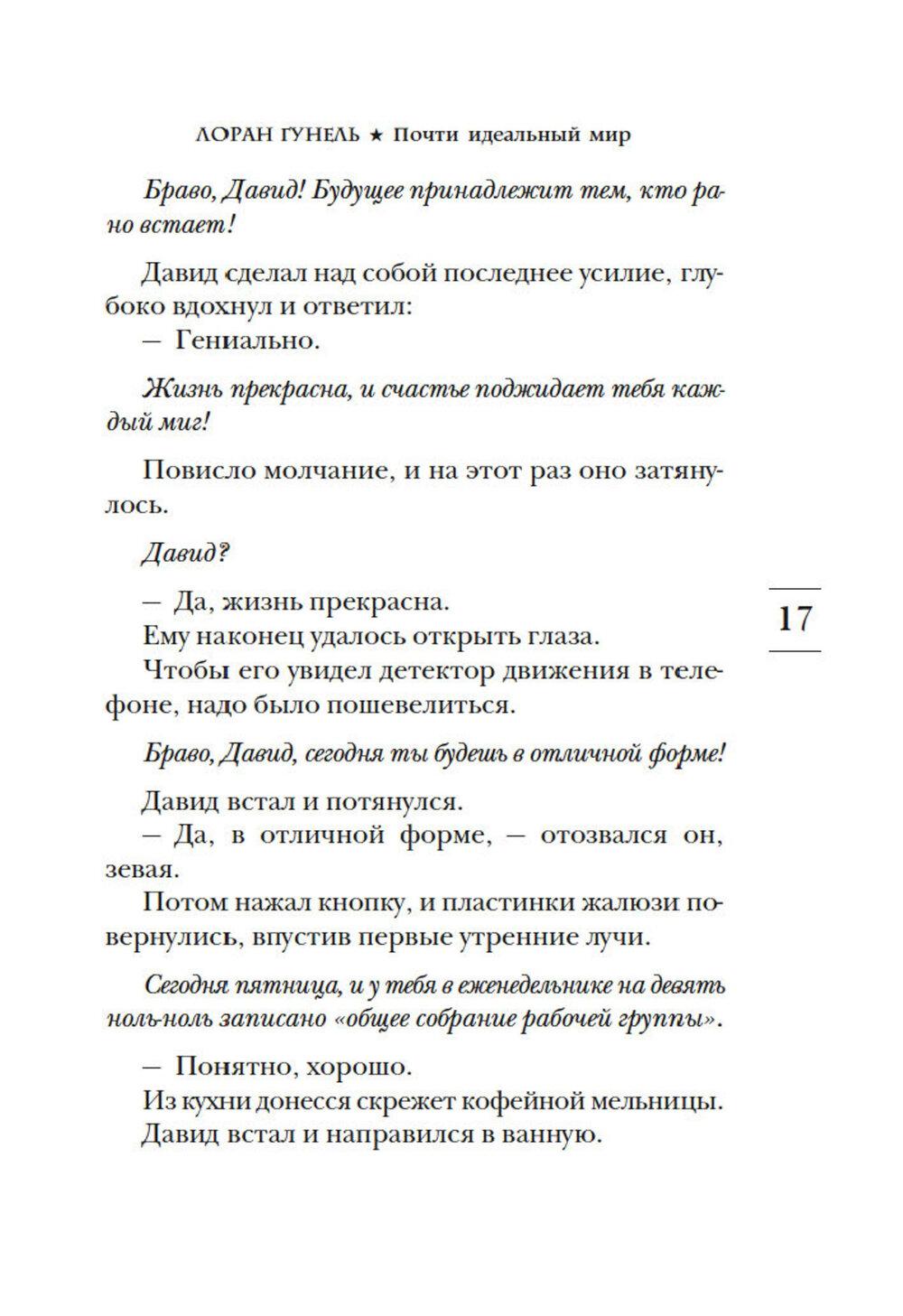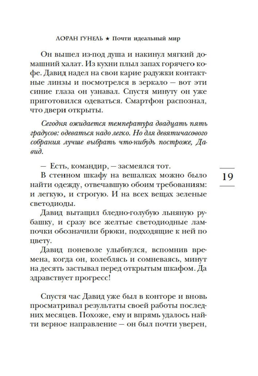 СОДЕРЖИТ ИНФОРМАЦИЮ О НАРКОТИЧЕСКИХ ИЛИ ПСИХОТРОПНЫХ ВЕЩЕСТВАХ, УПОТРЕБЛЕНИЕ КОТОРЫХ ОПАСНО ДЛЯ ЗДОРОВЬЯ. ИХ НЕЗАКОННЫЙ ОБОРОТ ВЛЕЧЕТ УГОЛОВНУЮ ОТВЕТСТВЕННОСТЬ. Мир, в котором живет программист Давид Лизнер, раскололся надвое. С одной стороны - высокоразвитое общество Правильных: они избавлены от болезней, бедности и сомнений, не обязаны работать, никогда не расстаются с телефонами, получают бонусы, если исправно выполняют рекомендации многочисленных мобильных приложений, и рискуют оказаться на обочине, если перестают слушаться. Большинство довольны такой жизнью, хотя счастливы ли - вопрос открытый. С другой стороны - Изгои; не смирившись с тотальным технологическим порабощением и информационным контролем, они переселились на остров, куда Правильные предпочитают не соваться. Давиду, впрочем, придется. Он должен сообщить девушке по имени Эва Монтойя, что у нее умер дядя, великий социолог, и добыть его последнюю научную работу, которая грозит подорвать устои почти идеального мира, в котором Давиду так комфортно. Однако свободолюбивая Эва задает массу неудобных вопросов, и постепенно Давид и сам начинает недоумевать. А почему, собственно говоря, он обязан покорно подстраиваться под чужие ожидания?.. С выхода первых же своих романов Лоран Гунель, специалист по психологии развития личности, прочно вошел в пятерку самых популярных французских беллетристов. Он автор десяти книг, переведенных на сорок языков, его произведения стоят в одном ряду с книгами Марка Леви и Гийома Мюссо. Его новый роман «Почти идеальный мир» - наглядная, прозрачная история о том, что происходит, когда люди ради повседневного комфорта отдают свое право выбора властям или алгоритмам. Наша жизнь принадлежит только нам. Только мы решаем, какой она будет и в целом, и в мелочах. Давайте не будем отказываться от своего права решать самим. И пусть новый роман Лорана Гунеля нас вдохновляет.| Издательство | Азбука |